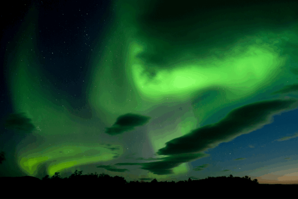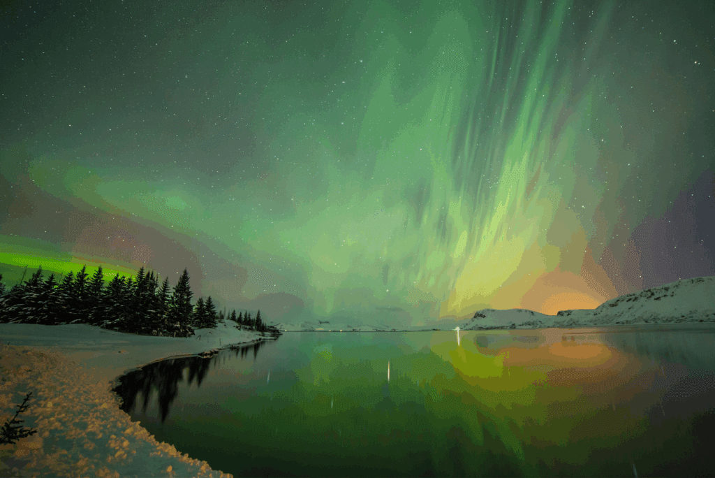 The aurora borealis, commonly known as the Northern lights, is a burst of colored lights, forming a pattern in the night sky caused by particles from the sun interacting with Earth's magnetic field. They are natural phenomena happening all year, but only visible to the human eye during the winter months when it's dark. The Northern lights can only be visible in the right conditions, with partly clear skies and darkness, and being a natural phenomenon, they can be unpredictable and very elusive.