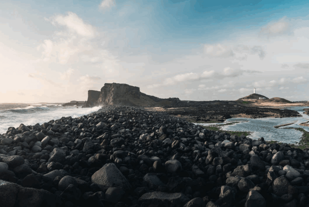 We continue our way to the Bridge Between Continents, a symbolic bridge over a fissure between the North American and Eurasian tectonic plates. With the Mid-Atlantic Ridge lying through and these plates constantly rafting, this is among the few places on Earth where they can be seen above ground. Next up is the colorful and active geothermal area Gunnuhver, with mud pools, hot springs, and steam vents surrounded by lava fields and a sulphuric landscape. Walking trails run throughout the area between observation decks, overlooking this spectacular ever-changing area. A short drive from there takes you to Reykjanesviti, the oldest lighthouse in Iceland on top of a hill dating back to 1907. A walking path leads to the peak of Valahnúkur, where the first-ever lighthouse built in Iceland stood, before being damaged by earthquakes and powerful waves on this most southwestern point of the peninsula. Valahnúkur is an eroded sea cliff that formed in an eruption over 10,000 years ago and is now a popular nesting site for seabirds. The music video Volcano Man starring Will Ferrell and Rachel McAdams was mainly shot here. Valahnúkamöl is a beach filled with large boulders created by powerful storms and waves, and looking out into the Atlantic Ocean is Eldey, a high stack of islands with the largest gannet colony in the world. The last mating pair of Great Auks were killed there in 1844, and by Valahnúkur is a statue of a Great Auk in memory of this extinct species.
