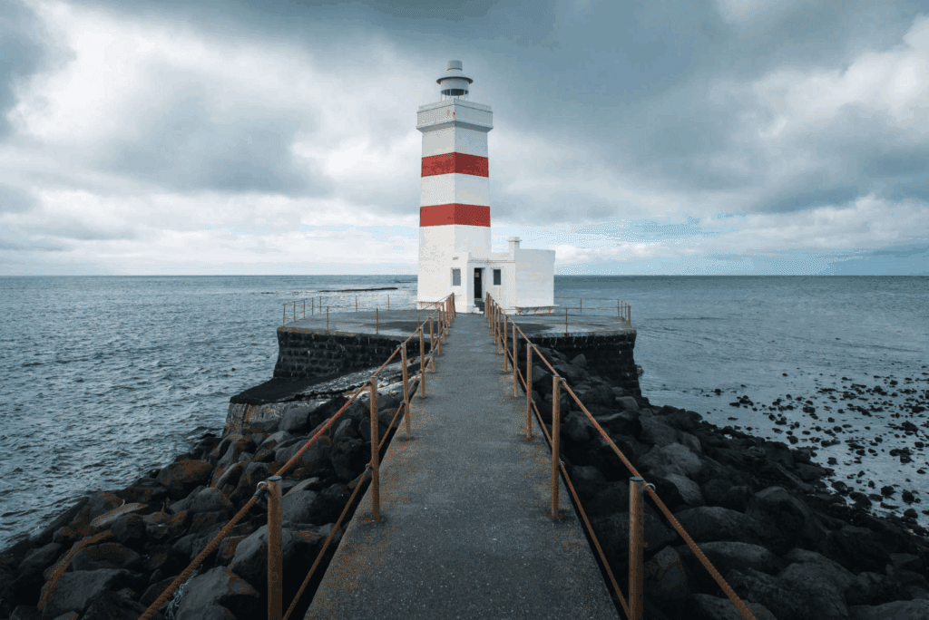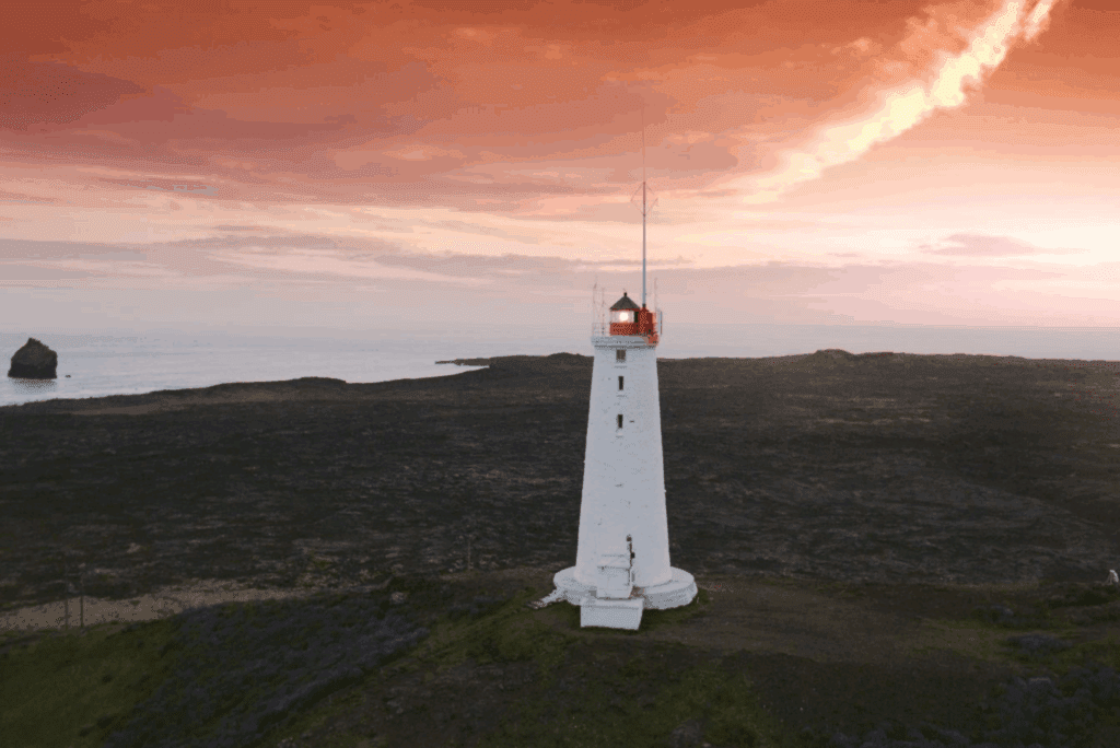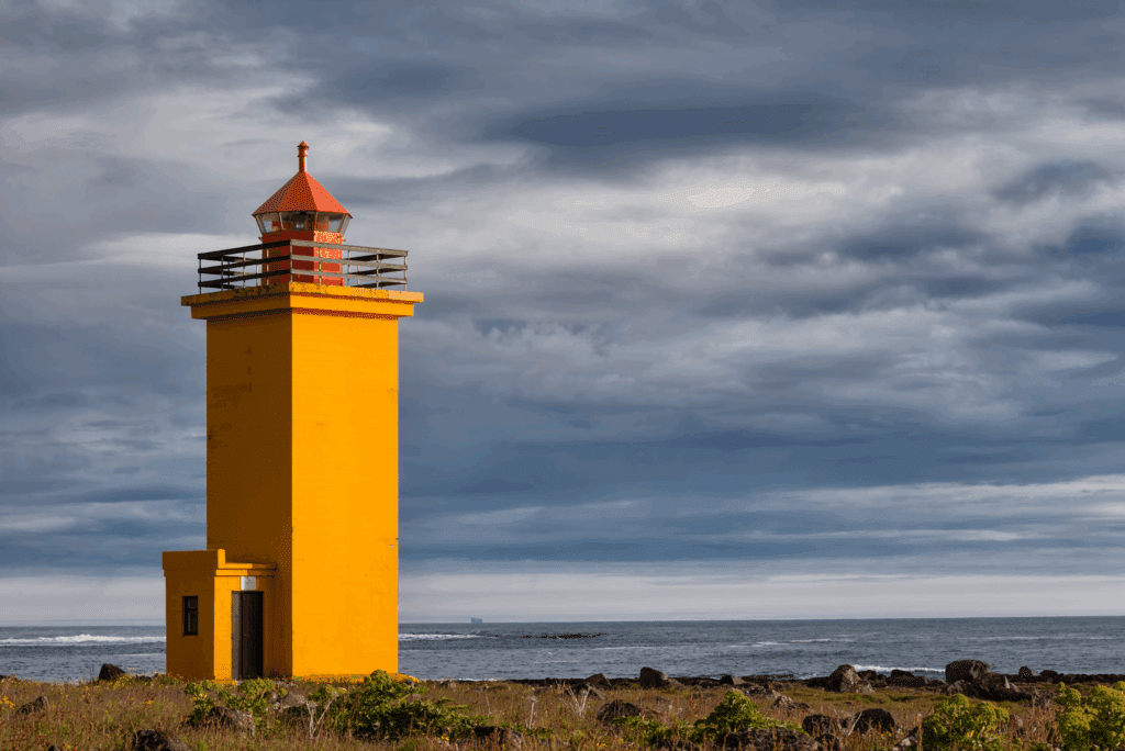 The picturesque yellow-colored Stafnesviti lighthouse stands on the headland Stafnes and was built in 1925. It overlooks the scenic rocky coast of Básendar, a former market town, and old fishing and trading post which was the largest royal fishery at the time. Since before the 16th century it was the biggest fishery in the area until 1799 when a powerful storm swept over. This caused the worst flood ever to happen in the area, named Básendaflóð. The flood destroyed all buildings and changed the shoreline forever, killing only one woman.
