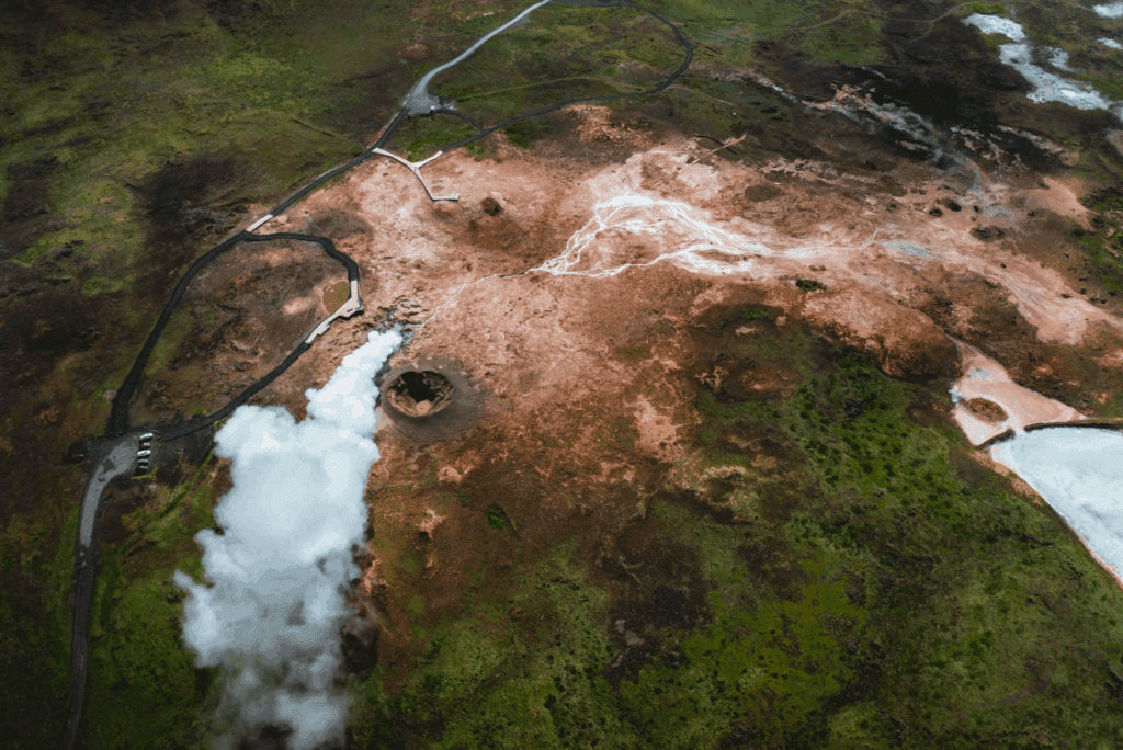 Close to the Reykjanesviti lighthouse is a highly active and colorful geothermal area, surrounded by lava fields and a sulphuric landscape. It is collectively known as Gunnuhver and consists of vigorous mud pools, hot springs, and steam vents, forming after an earthquake in 1967. In this area resides the largest mud pool in Iceland, 20 m (65 ft) wide. What makes these hot springs unique is the groundwater that is 100% boiling seawater, unlike other hot springs in Iceland. This area is very active and is constantly shifting and changing its behavior due to earthquakes. The ground is over 300°C (570°F) in temperature so care must be taken when treading the labeled walking trails between observation decks and be aware of your surroundings as hot steam can sometimes blow in your way.