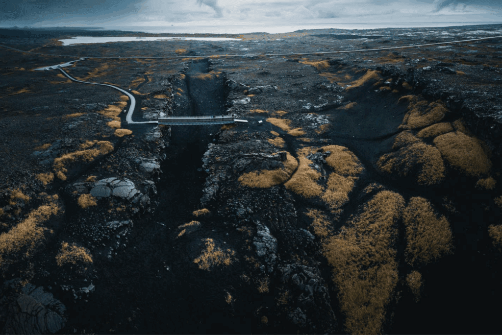 The Bridge Between Continents (is. Brú milli heimsálfa, also Miðlína, meaning “Centreline”), aka Leif the Lucky Bridge, is a symbolic footbridge spanning a rocky fissure between the North American and Eurasian tectonic plates. This wide tension crack opened up between these plates due to their constant movements, rafting on average about 2 cm every year. The Mid-Atlantic Ridge runs through Iceland from the North-East corner to the South-West corner and the tectonic plates can only be seen above ground in a few locations.