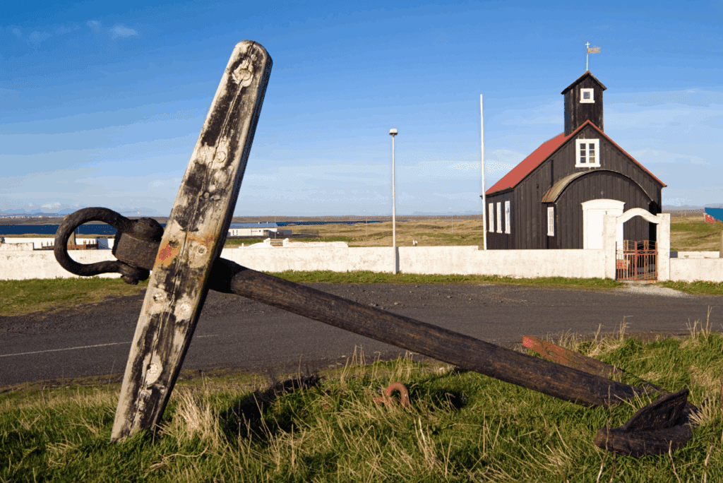 In 1881 the American abandoned sailing ship Jamestown ran aground in Hafnir. When crossing the Atlantic Ocean, the ship encountered heavy seas tearing the rudder off. The captain and his crew were rescued and the Jamestown left to drift for the next four months. On the morning of June 26th, the residents of Hafnir woke up finding the Jamestown had run aground. Carrying high-quality timber to transport from Boston to Liverpool, the valuable timber was sold at auction by the locals and used to build houses and bridges widely in Iceland. An anchor from this ship is situated outside of the Kirkjuvogskirkja church.