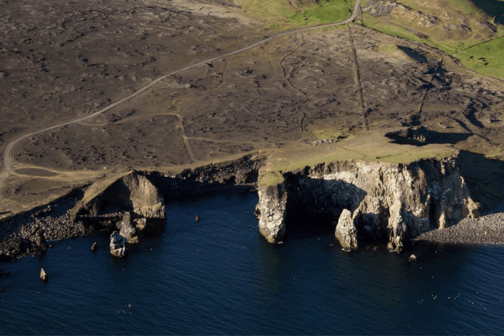 Valahnúkur is the most south-western point of the Reykjanes peninsula. It is an eroded sea cliff made of palagonite tuff layers, pillow lava, and volcanic agglomerate. This peak formed in a single eruption 10,000 years ago but its surroundings show evidence of other eruptions too. Its palagonite tuff formed in explosions during the eruption when the 1200°C (2192°F) melted lava rapidly cooled while flowing into the sea. The pillow lava is however believed to have formed in a sub-glacial eruption since these formations develop during eruptions underwater and under glaciers. Valahnúkur is a popular nesting place for herring gulls, fulmars, kittiwakes, and ravens. If you’ve seen the film Eurovision Song Contest: The Story of Fire Saga, featuring Will Ferrell and Rachel McAdams, you may notice that the music video for Volcano Man was shot by Valahnúkur. Next to Valahnúkur is the beach Valahnúkamöl which is made of large boulders created by powerful storms and high waves. A 52 m (170 ft) high palagonite pillar called Karl (e. Man) stands not far from Valahnúkur out in the sea.