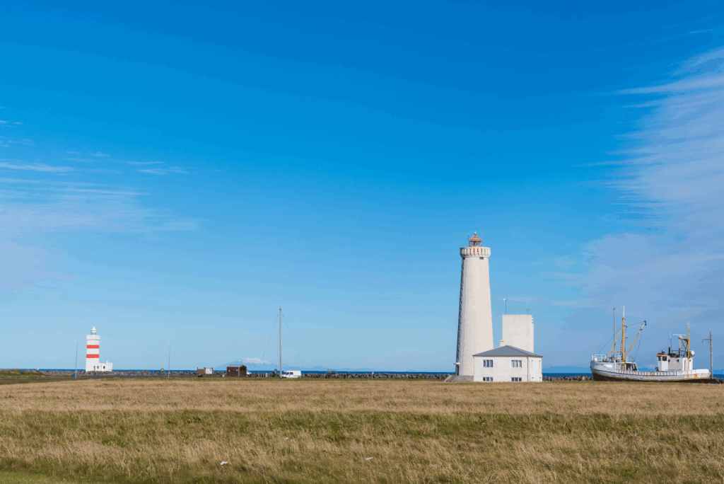 This is a very popular place to visit due to the unique 360° view the lighthouses offer. On sunny days you can see all the way to the Snæfellsjökull glacier on the Snæfellsnes peninsula, Esja mountain hovering over the Reykjavik Capital Area, and surrounding mountain rows. Garðskagi is also the home of varied sea bird species and some days you can even spot seals and whales playing, from the dock of the Old Lighthouse Café.