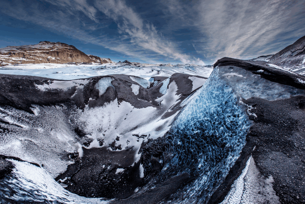 Sólheimajökull is the most popular outlet glacier for glacier hiking, offering a spectacular view of the vast black sand desert, Sólheimasandur. It was formed in a glacier outburst flood from the Katla volcano system lying underneath Mýrdalsjökull. The desert also houses the wreckage of a DC-3 plane from the US Navy, which ran out of fuel and landed there in 1973. All aboard survived the landing; the wreckage was left there, making it a popular attraction. However, it is forbidden to drive to the wreckage, and it’s strongly advised against trying to walk to it since people can get lost or, even worse, lose their lives, as some have.