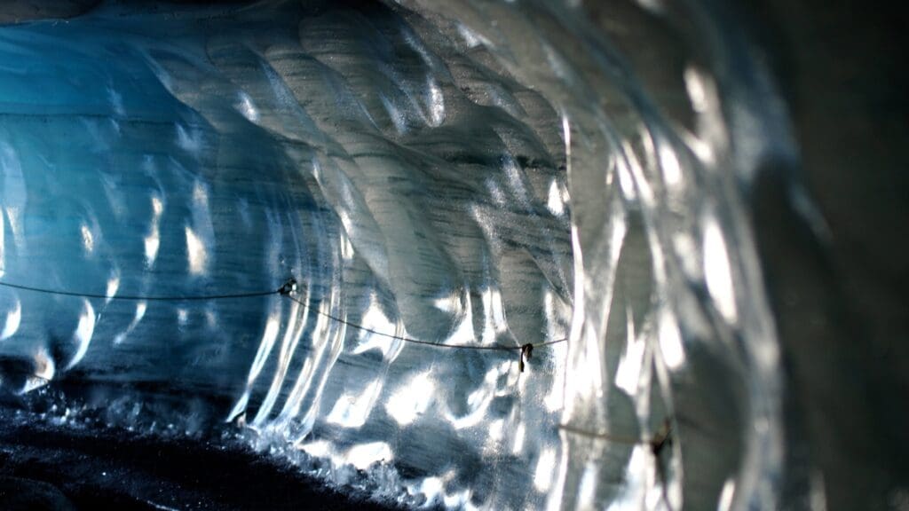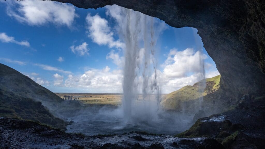 The highlight of this South Coast tour in Iceland is a guided excursion to the stunning Katla Ice Cave. Hidden beneath the mighty Mýrdalsjökull glacier, this natural wonder showcases ancient blue ice formations mixed with volcanic ash layers. Unlike other glacier caves, Katla Ice Cave is accessible year-round, making it one of the best ice cave tours from Reykjavík.