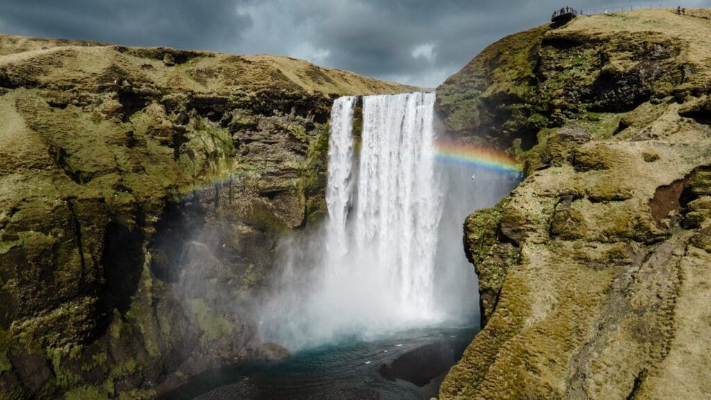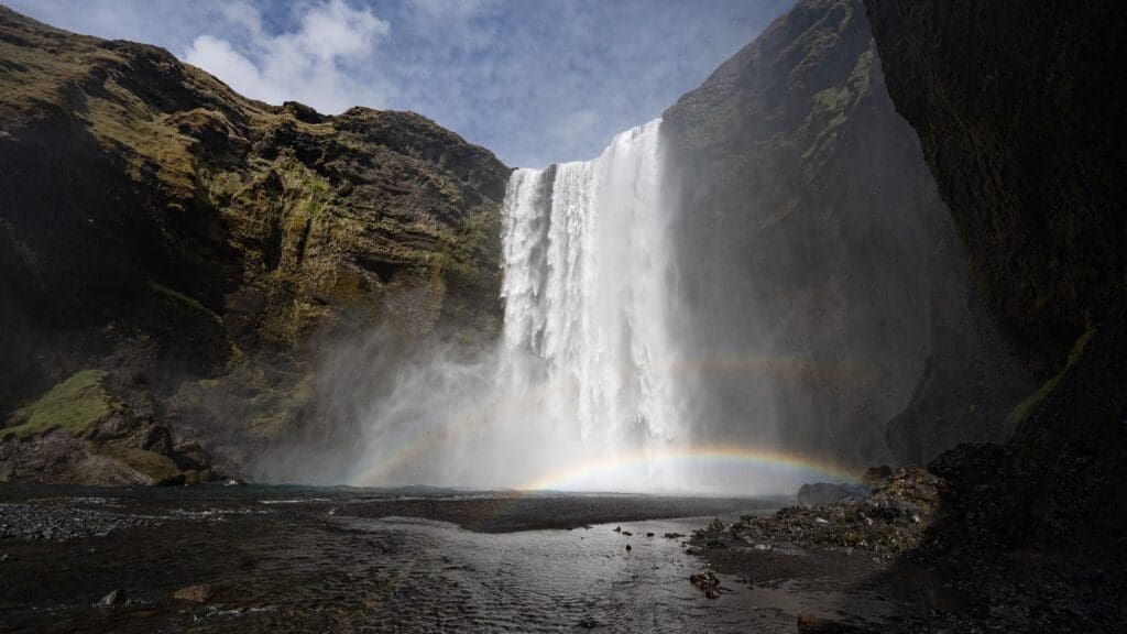 Your adventure begins heading straight to two of Iceland’s most famous waterfalls after your pick-up. Seljalandsfoss offers the unique experience of walking behind its cascading waters, while Skógafoss, one of the tallest waterfalls in the country, impresses with its sheer power and beauty.