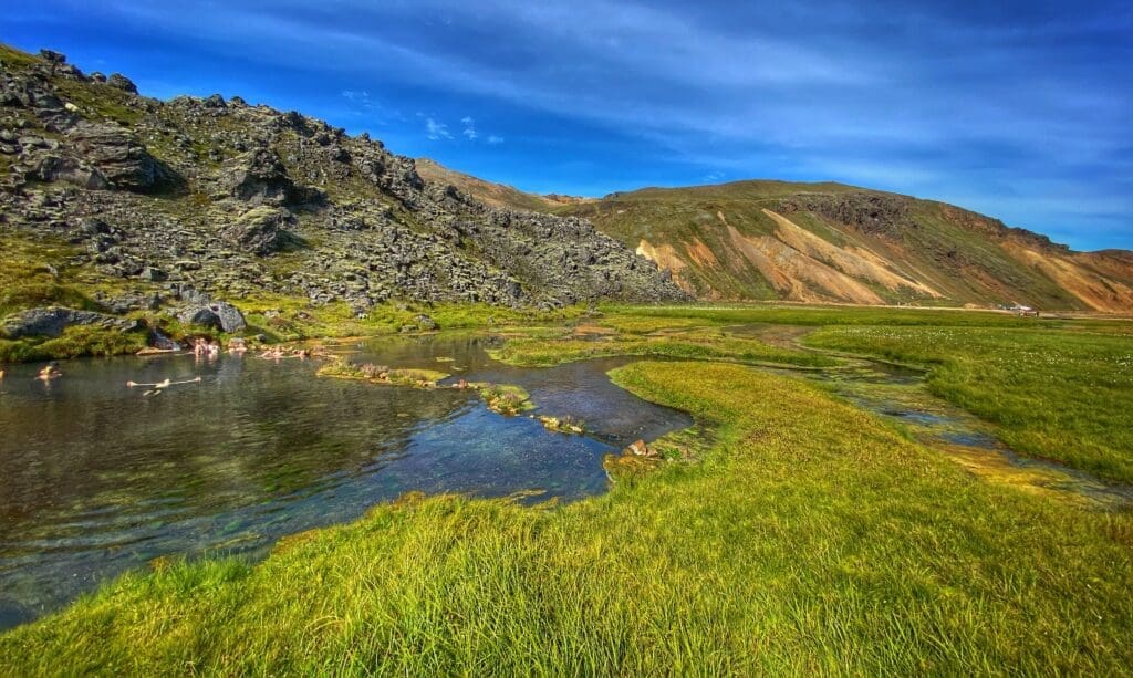 Landmannalaugar and the surrounding nature reserve is one of the most beautiful geological landscapes of Iceland, and beyond. The landscape resembles an adventure or a painting with beautifully coloured bright green, yellow and pink rhiolithic mountains with patches of black shiny obsidian. Landmannalaugar is often the starting point of the well know Laugavegur, a few days hiking trail to Þórsmörk nature reserve.