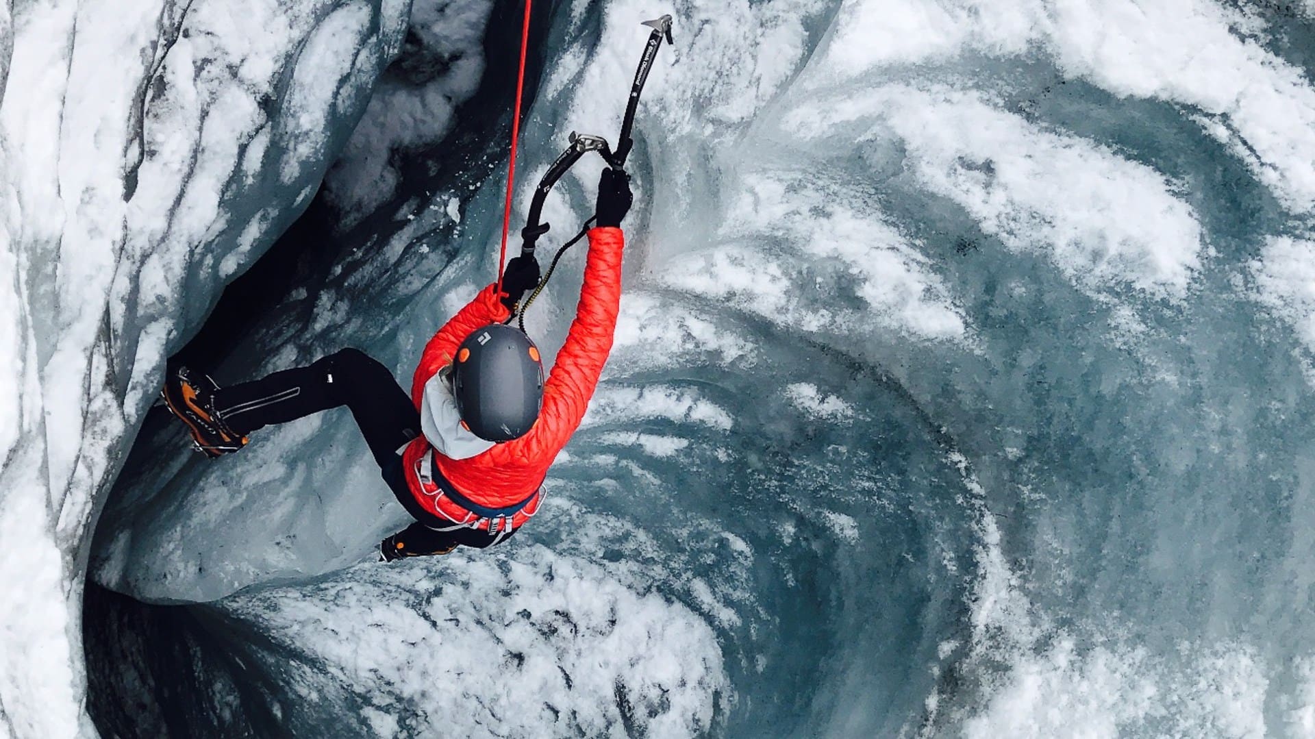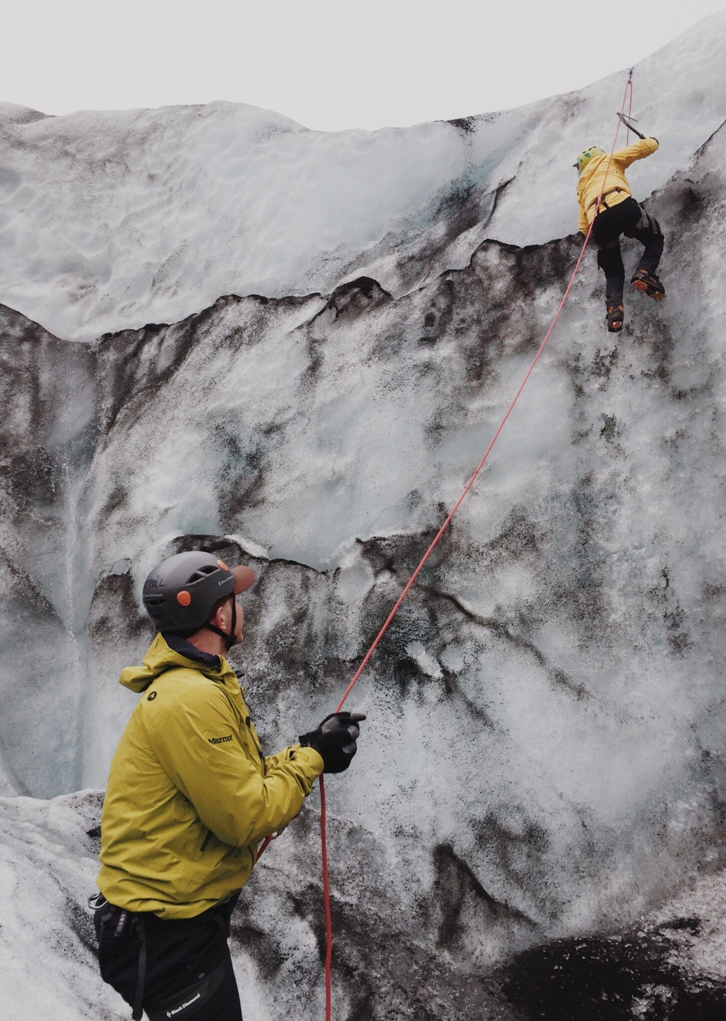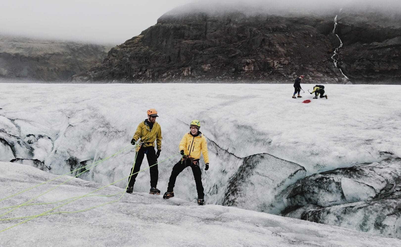 This is a comprehensive glacier tour, where you’ll learn about these massive natural phenomena from your guide and be provided with all the necessary equipment to get some exercise in full comfort and safety. You will also learn the basics of ice climbing and climb the vertical crevasse walls of Sólheimajökull glacier. This tour is for anyone looking to experience one of the natural wonders of the earth. You’ll meet your guide in the Sólheimajökull parking lot and then make your way to the ice itself, a brisk 30-minute walk to get the blood flowing. (The glacier was once closer to the lot, but warming weather and the glacier’s own movement has caused it to recede into the distance.) Sólheimajökull is an outlet glacier of Mýrdalsjökull, one of the biggest glaciers in Europe. It is featured in detail in the 2012 documentary “Chasing Ice,” an award-winning investigation of climate change. Once you reach the ice, you’ll be given plenty of time to marvel at the eerie silence and feeling of isolation, as if you and your fellow hikers are alone in a vast, empty world of ice and snow. You’ll view millennia-old blue ice, created when oxygen bubbles are trapped in the snow and compressed into ice by the enormous weight of the glacier pressing down upon it. You’ll be able to gaze deep into a glacier moulin, a vertical shaft like a well, which can go all the way to the bottom of the glacier. The guide will set up a climbing rope and you will learn how to ascend a vertical wall using ice axes and crampons. What’s down there? The ice cap sits on top of the mighty Katla volcano, one of the largest and most active volcanoes in Iceland. On a clear day, you may also be able to see Eyjafjallajökull, another glacier to the east which famously brought European air traffic to a halt in 2010 when its eruption filled the sky with fire and ash. Never been on a glacier walk before? Never used crampons or ice axe? No worries! Experienced guides will teach you all you need to know and have you walking safely on the glacier in no time. Safety equipment and briefings are provided before each tour. Nature is best experienced free of worries!