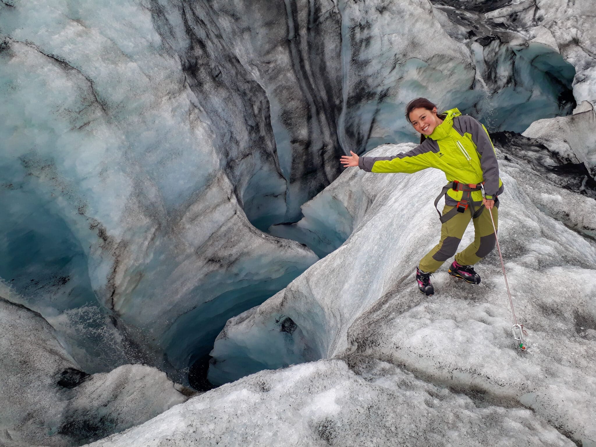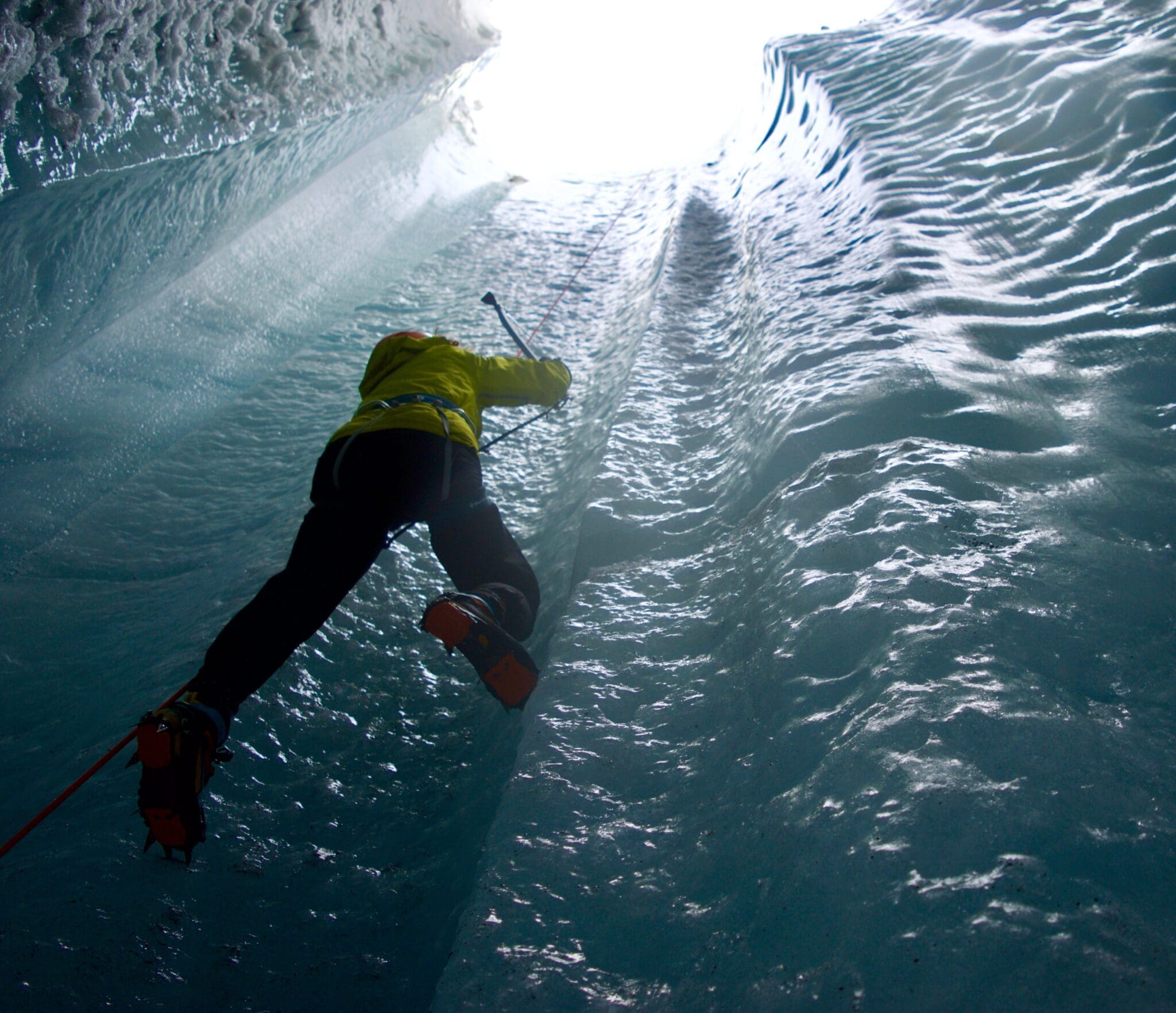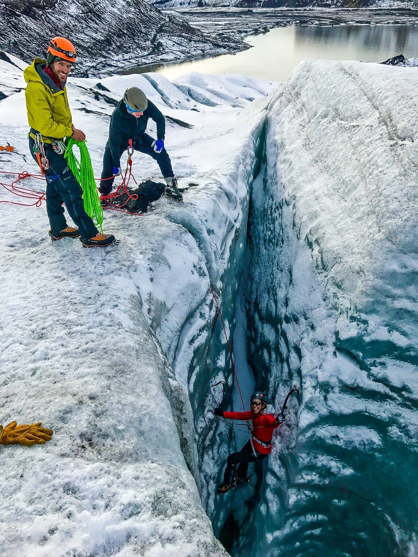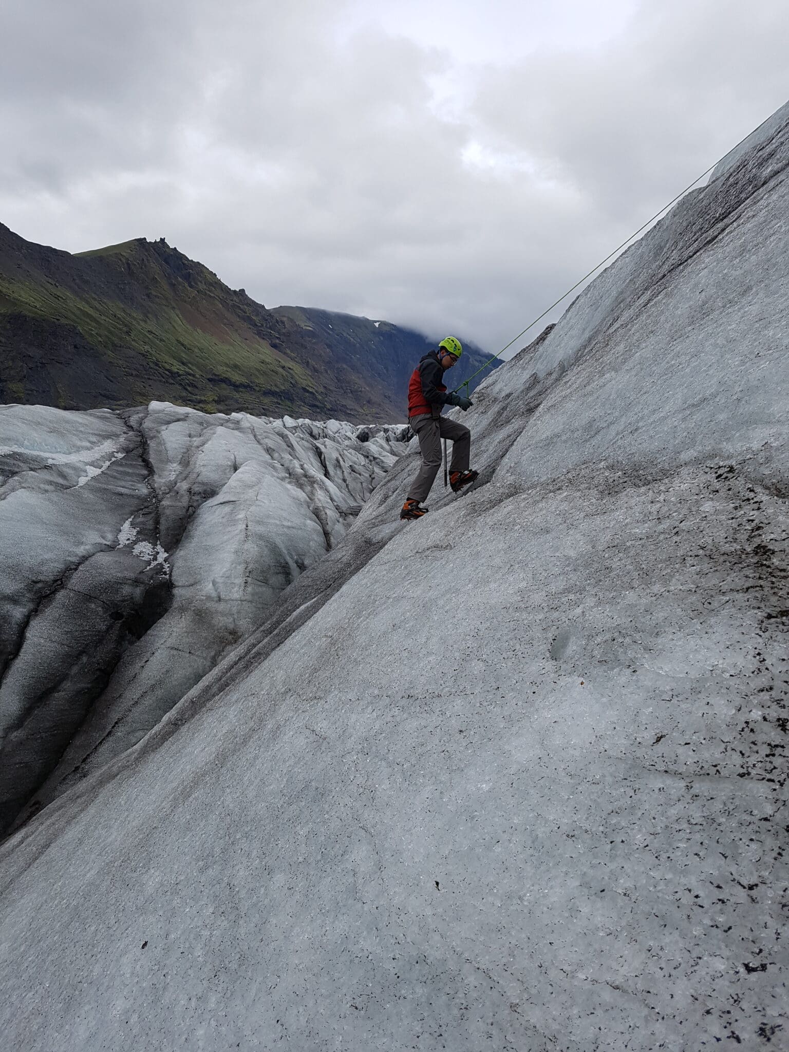 This is a comprehensive glacier tour, where you’ll learn about these massive natural phenomena from your guide and be provided with all the necessary equipment to get some exercise in full comfort and safety. You will also learn the basics of ice climbing and climb the vertical crevasse walls of Sólheimajökull glacier. This tour is for anyone looking to experience one of the natural wonders of the earth. You’ll meet your guide in the Sólheimajökull parking lot and then make your way to the ice itself, a brisk 30-minute walk to get the blood flowing. (The glacier was once closer to the lot, but warming weather and the glacier’s own movement has caused it to recede into the distance.) Sólheimajökull is an outlet glacier of Mýrdalsjökull, one of the biggest glaciers in Europe. It is featured in detail in the 2012 documentary “Chasing Ice,” an award-winning investigation of climate change. Once you reach the ice, you’ll be given plenty of time to marvel at the eerie silence and feeling of isolation, as if you and your fellow hikers are alone in a vast, empty world of ice and snow. You’ll view millennia-old blue ice, created when oxygen bubbles are trapped in the snow and compressed into ice by the enormous weight of the glacier pressing down upon it. You’ll be able to gaze deep into a glacier moulin, a vertical shaft like a well, which can go all the way to the bottom of the glacier. The guide will set up a climbing rope and you will learn how to ascend a vertical wall using ice axes and crampons. What’s down there? The ice cap sits on top of the mighty Katla volcano, one of the largest and most active volcanoes in Iceland. On a clear day, you may also be able to see Eyjafjallajökull, another glacier to the east which famously brought European air traffic to a halt in 2010 when its eruption filled the sky with fire and ash. Never been on a glacier walk before? Never used crampons or ice axe? No worries! Experienced guides will teach you all you need to know and have you walking safely on the glacier in no time. Safety equipment and briefings are provided before each tour. Nature is best experienced free of worries!