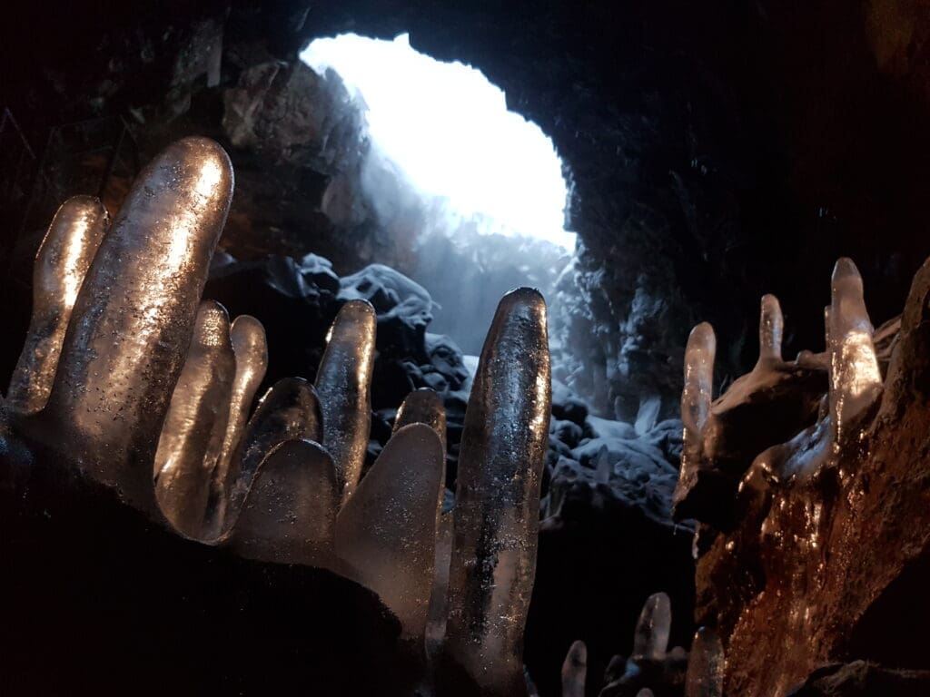 You walk around 350 metres into the lava tunnel and the temperature in the cave is around 4 degrees although it can be warmer outside and usually water leaks from the ceiling when it rains and snows so we recommend raincoats.