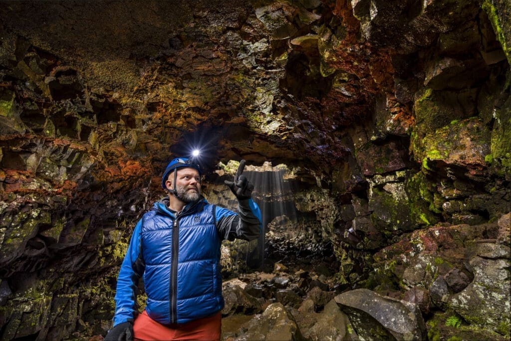 On this adventure, we visit the lava tunnel Raufarhólshellir located only 30 minutes from Reykjavík. We will witness the inner workings of a volcanic eruption while we walk in the path of a lava that flowed thousands of years ago. The lava tunnel is one of the biggest in Iceland and gets up to 30 metres wide and 10 metres high. The lava tube ceiling has caved in near the entrance, which creates beautiful columns of light. The fantastic range of colours of the tunnel wall is caused by the different mineral types of the rock.