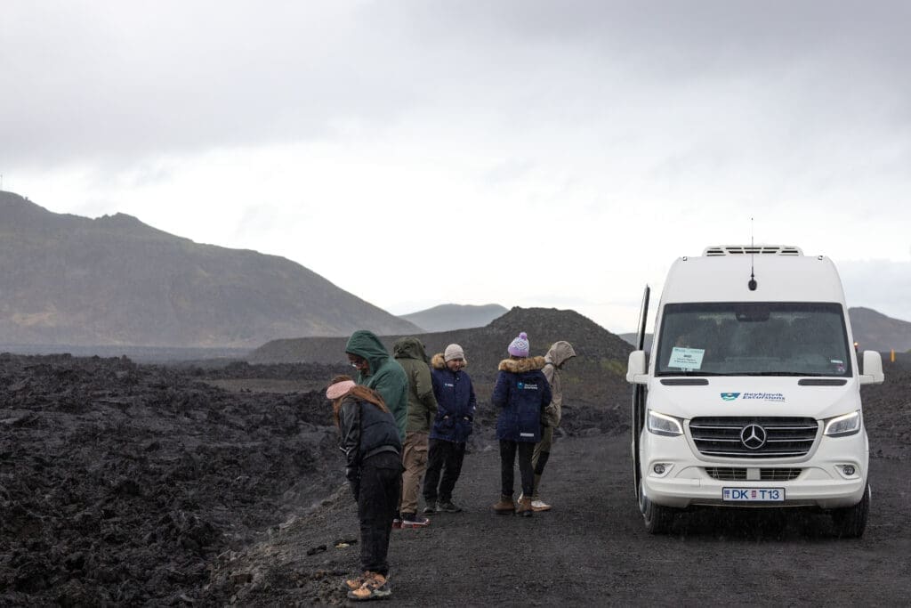 Next, visit Fagradalsfjall, one of Iceland’s youngest volcanoes. Hike through otherworldly terrain to a scenic viewpoint overlooking expansive lava fields created by recent eruptions. This moderately challenging hike covers 5.5 kilometers (3.4 miles) round trip, with an elevation gain of 300 meters (985 feet). Along the way, your expert guide will share insights into the region’s volcanic history and geology. You’ll have time to explore, take photos, and even touch rocks formed just three years ago.