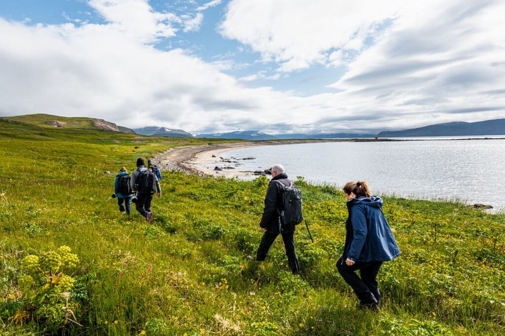 Arriving in Hesteyri, we get the chance to hike in pristine nature, observe wildlife, and search for the elusive Arctic foxes. After this, you will enjoy an early dinner of traditional fish soup at the historic Doctors house, followed by Icelandic pancakes for dessert*.