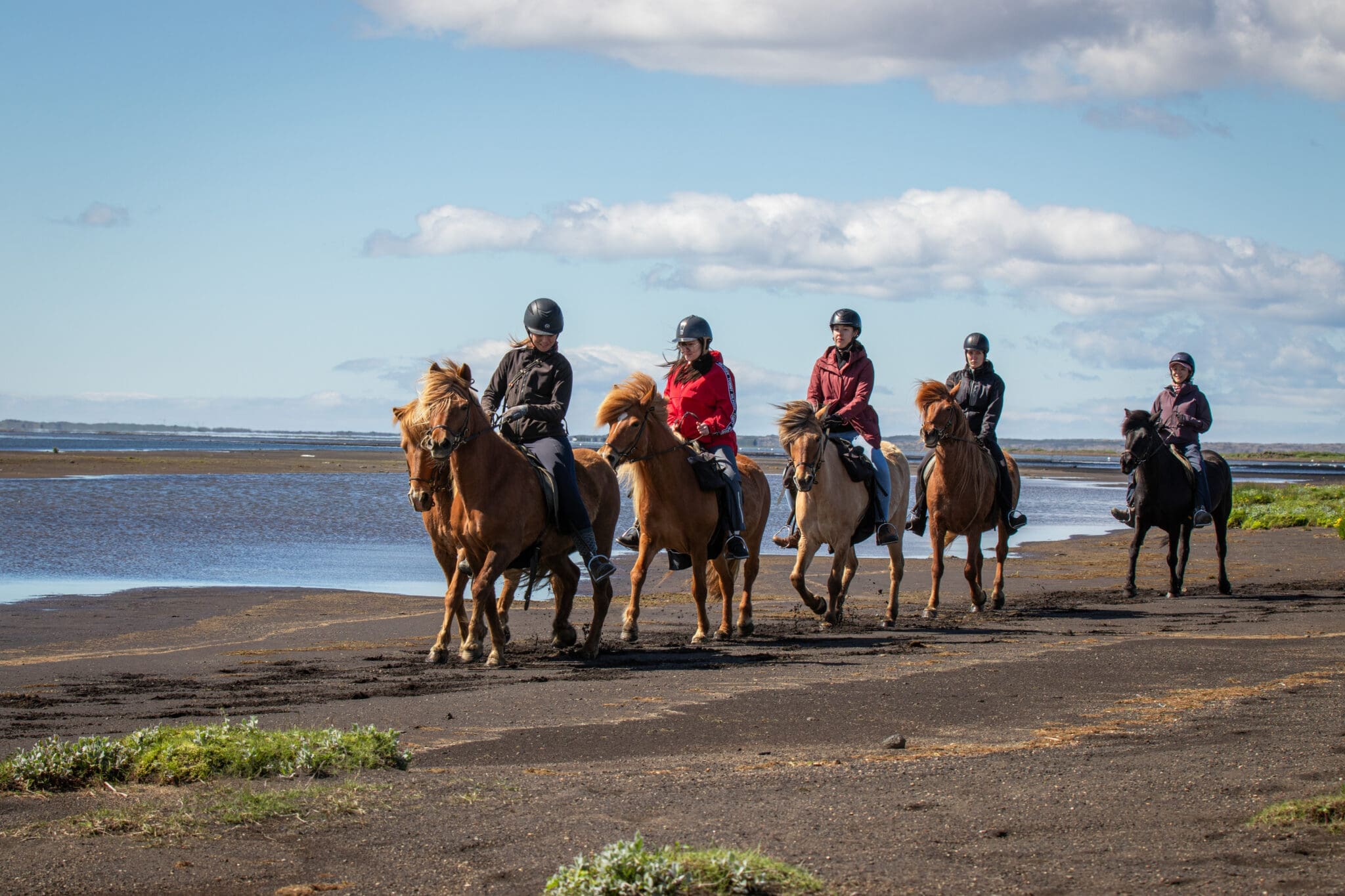 Discover the beautiful landscape opening up between the mountains and sea in southern Iceland. We ride along the Gljúfurá river to the banks of the Ölfusá river, with views of the famous volcanos Hekla and Eyjafjallajökull, weather permitting. We stop for a lunch break before continuing our ride towards the mountains and along Mt. Reykjafjall, where both sheep and horses graze in the summer. Awaiting us back at our farm are coffee and home-baked cake. During the winter season, we stop at our hotel for soup of the day before continuing our ride towards the mountains.