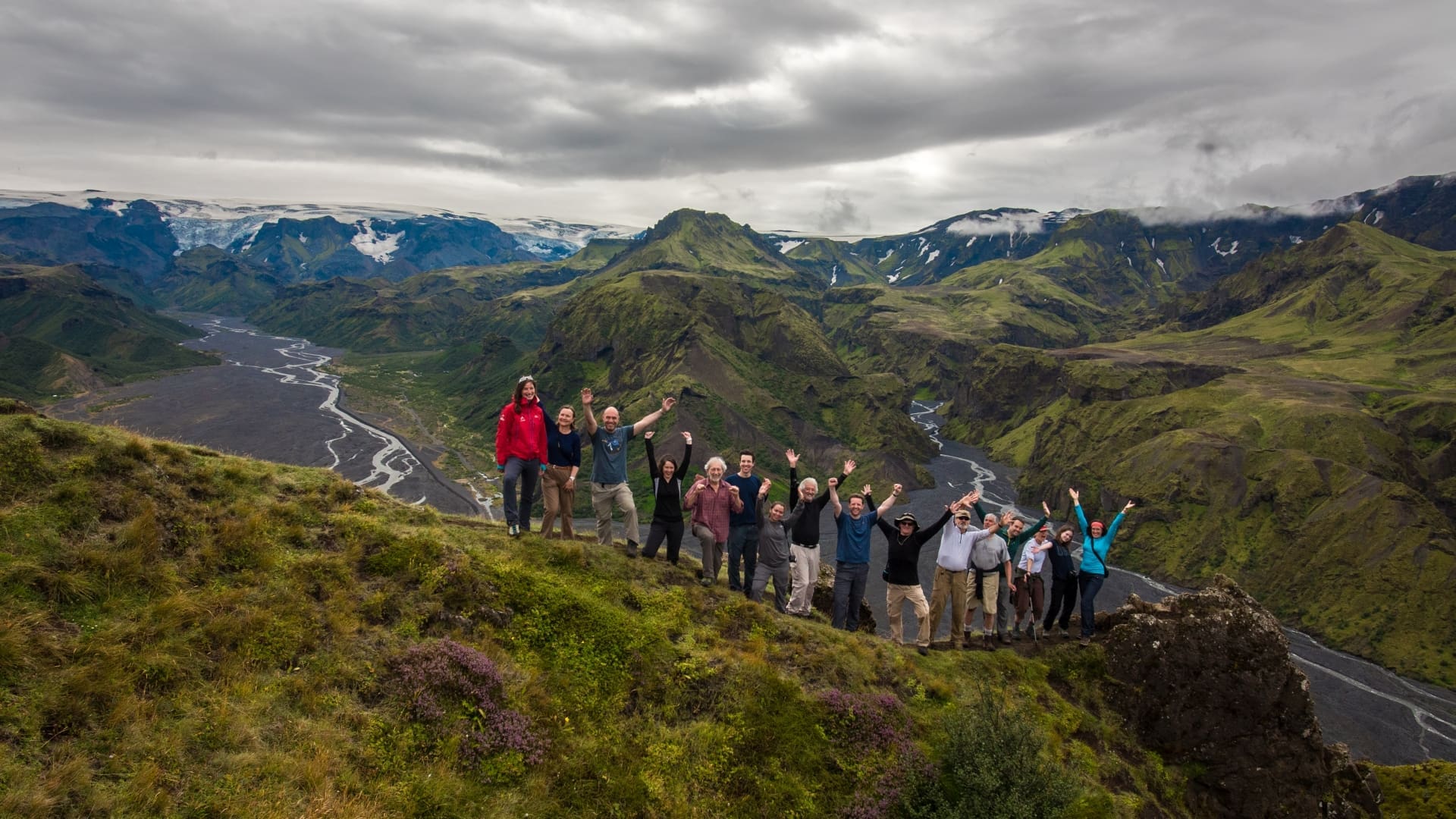 We continue up and down through the small valleys and gullies of Emstrur, where the great Mýrdalsjökull glacier rises only a couple of kilometers away. At the end of the day the vegetation starts to grow thicker and higher as we descend in to Þórsmörk’s (the woods of Thor) green valleys filled with arctic birch forests and colorful flowers. Night in one of the huts in Þórsmörk.