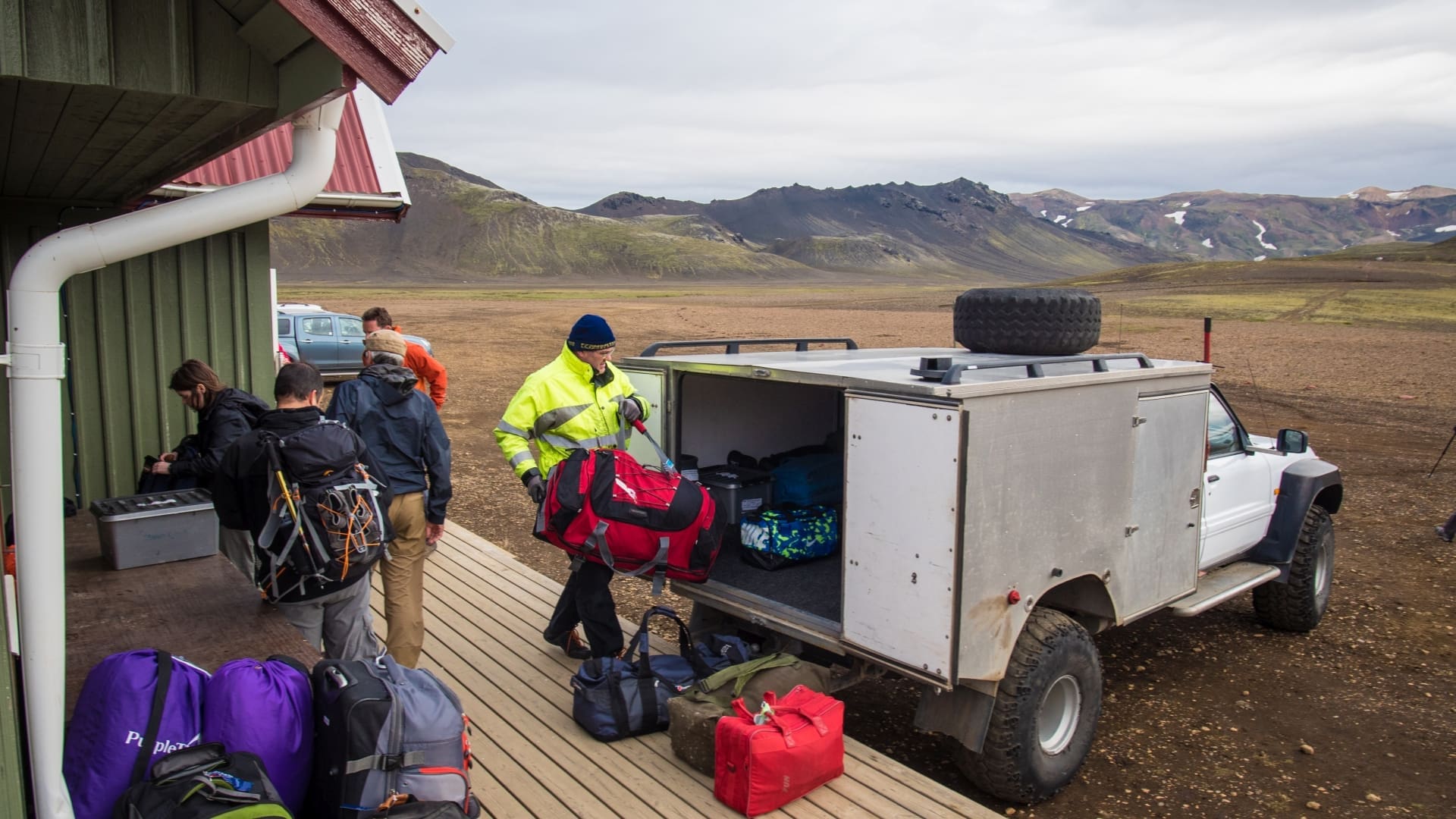 We take the regular bus from BSI bus terminal at 07:00, that during the summer months drives the mountain tracks that lead to Landmannalaugar, passing by the Hekla volcano and other volcanoes in the Dómadalur area. Arriving in Landmannalaugar at noon, we have a lunch and then head south into the mountains. The trail takes us past small gorges, steaming hot springs and yellow mountain ridges. Arrival at Hrafntinnusker mountain hut, were we will stay the night, in the late afternoon.