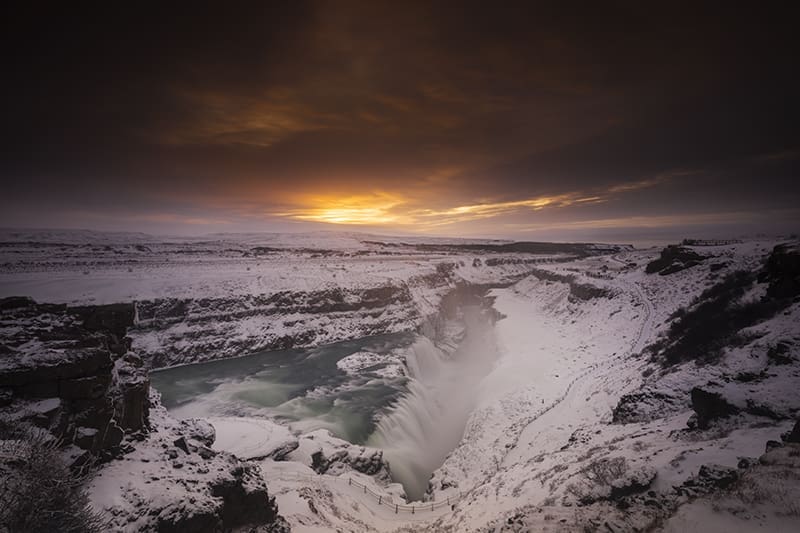 Next up is Gullfoss waterfall (The Golden Falls), one of Iceland’s most iconic waterfalls that has a drop of 32 meters over two tocky tiers. On a sunny day, you can see the glacier Langjökull in the distance and enjoy a rainbow in the mist of the waterfall.
