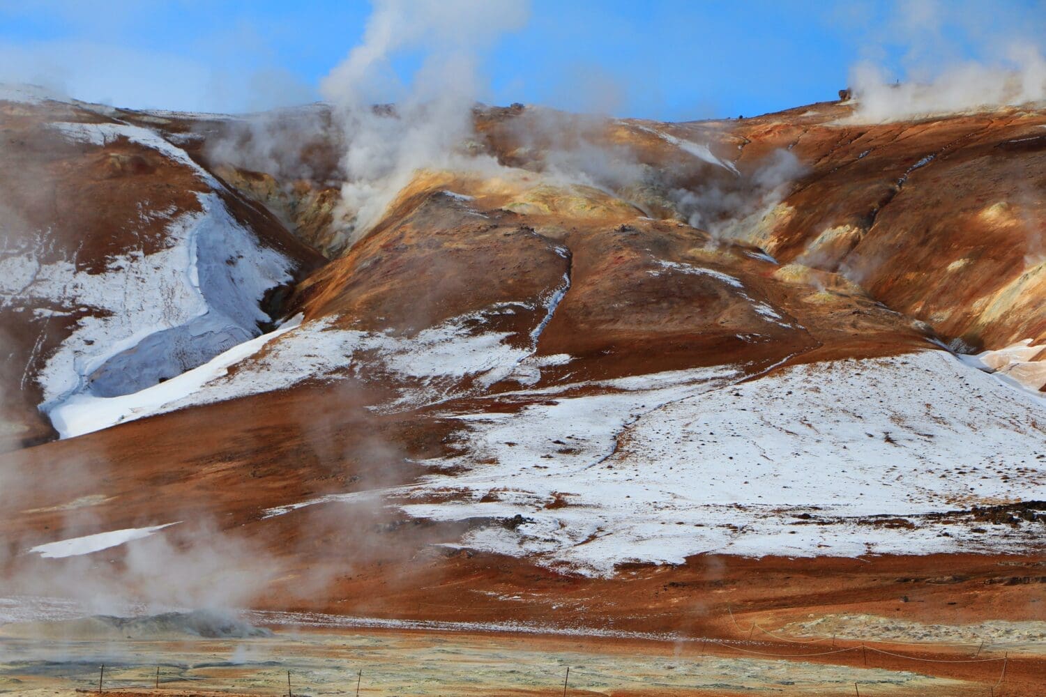 Next, visit Námaskarð geothermal area, known for its otherworldly landscapes and bubbling mud pots. Take a walk among the steaming vents and colorful mineral deposits, getting a glimpse of Iceland's geothermal activity up close.