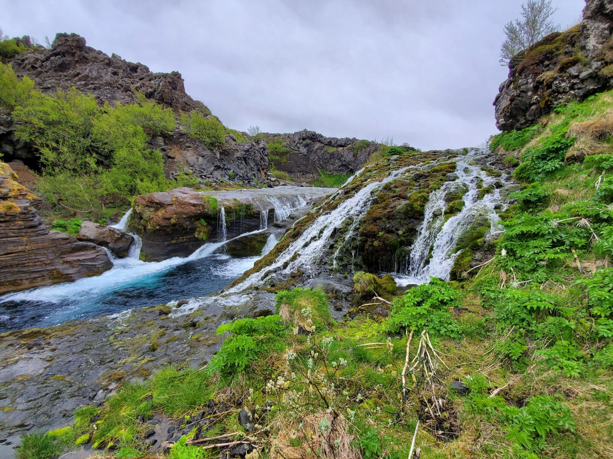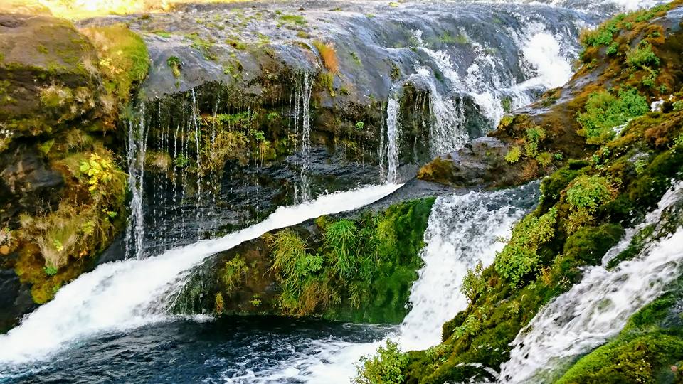 Hjálpafoss: Located in Þjórsárdalur Valley, this two-tiered waterfall is surrounded by basalt columns and green moss, offering a picturesque setting that’s perfect for photos.