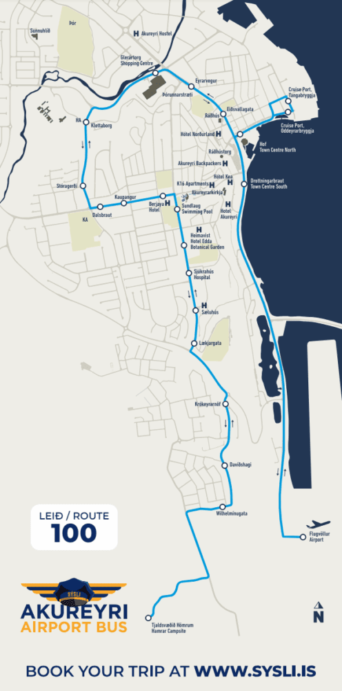 The route connects Akureyri Airport with the town of Akureyri. The route passes all of the main hotels in Akureyri and the campsite. Please note that we do not go into the hotels to pick up passengers.