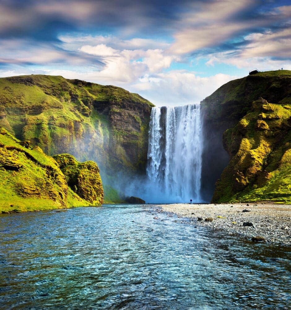 The powerful Skógafoss waterfall where a short walk up a flight of stairs will reveal one of Iceland´s most scenic views, glaciers, volcanoes and black sand beaches.