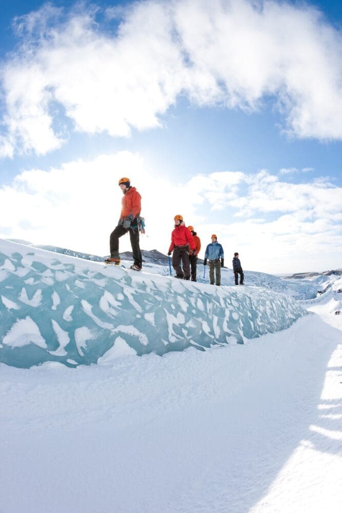 Your certified glacier guide will provide all the necessary equipment, including crampons, helmets, ice axes, and safety gear. After a safety briefing and gear fitting, you’ll hike across the glacier’s stunning landscape of crevasses, ice ridges, and blue-hued formations. Along the way, you’ll learn about the glacier’s geology and dynamic nature. You will be able to witness some breathtaking panoramic views, as well as crevasses, ridges and even an ice wall where you will have an introduction to ice climbing and will be able to experience it firsthand.