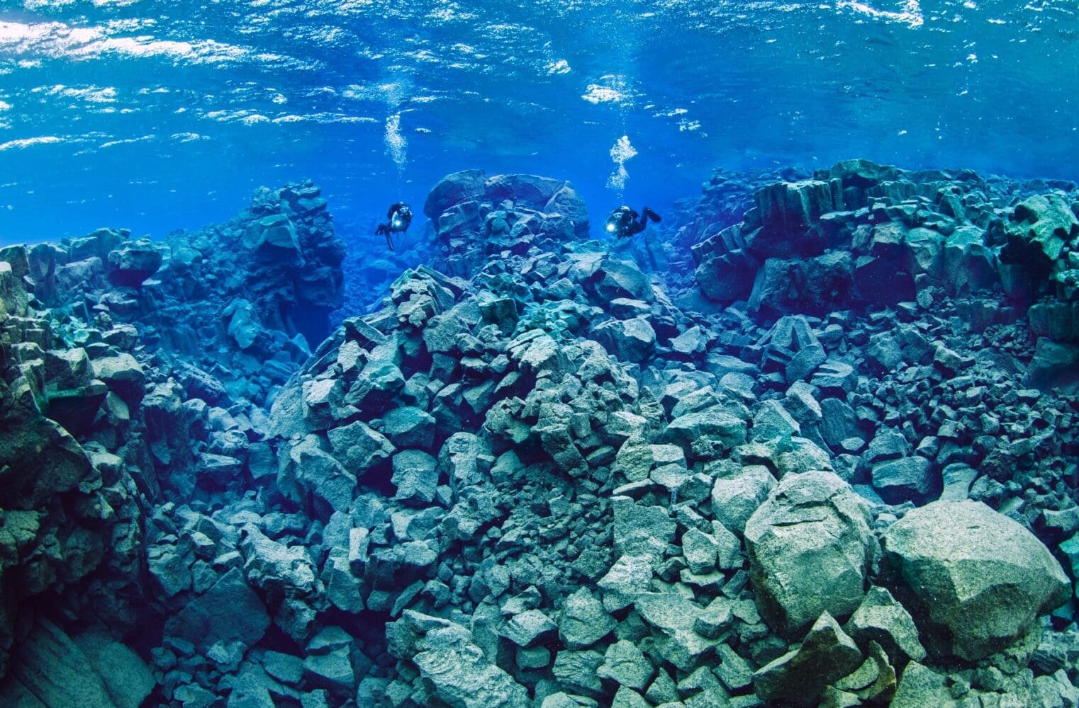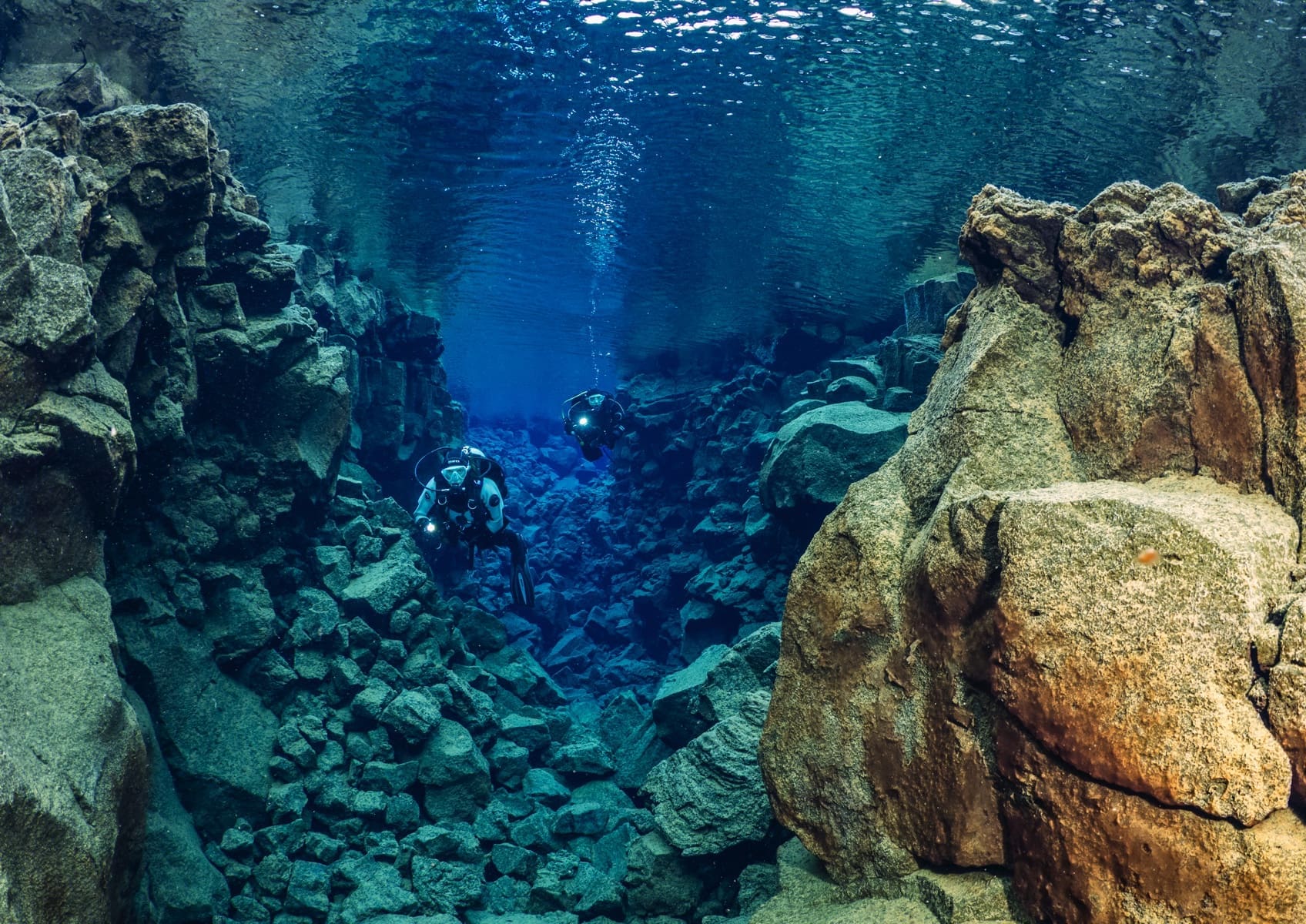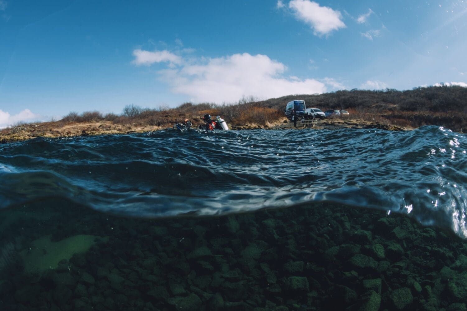 The top of the fissure in Davíðsgjá is actually about 7 meters underwater, which allows for more contact with the water in Thingvallavatn lake. It is therefore common that trout join the divers in exploring this fissure.