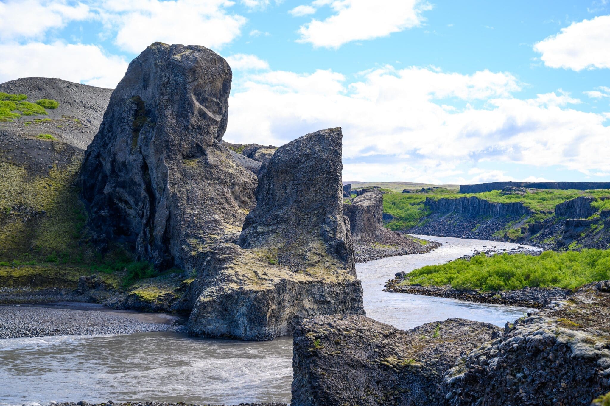These extraordinary rock formations, some of them standing in the middle of Jökulsá á Fjöllum glacial river, are the remains of an ancient row of craters that have been eroded for centuries after centuries by the strong currents and floods of the river.