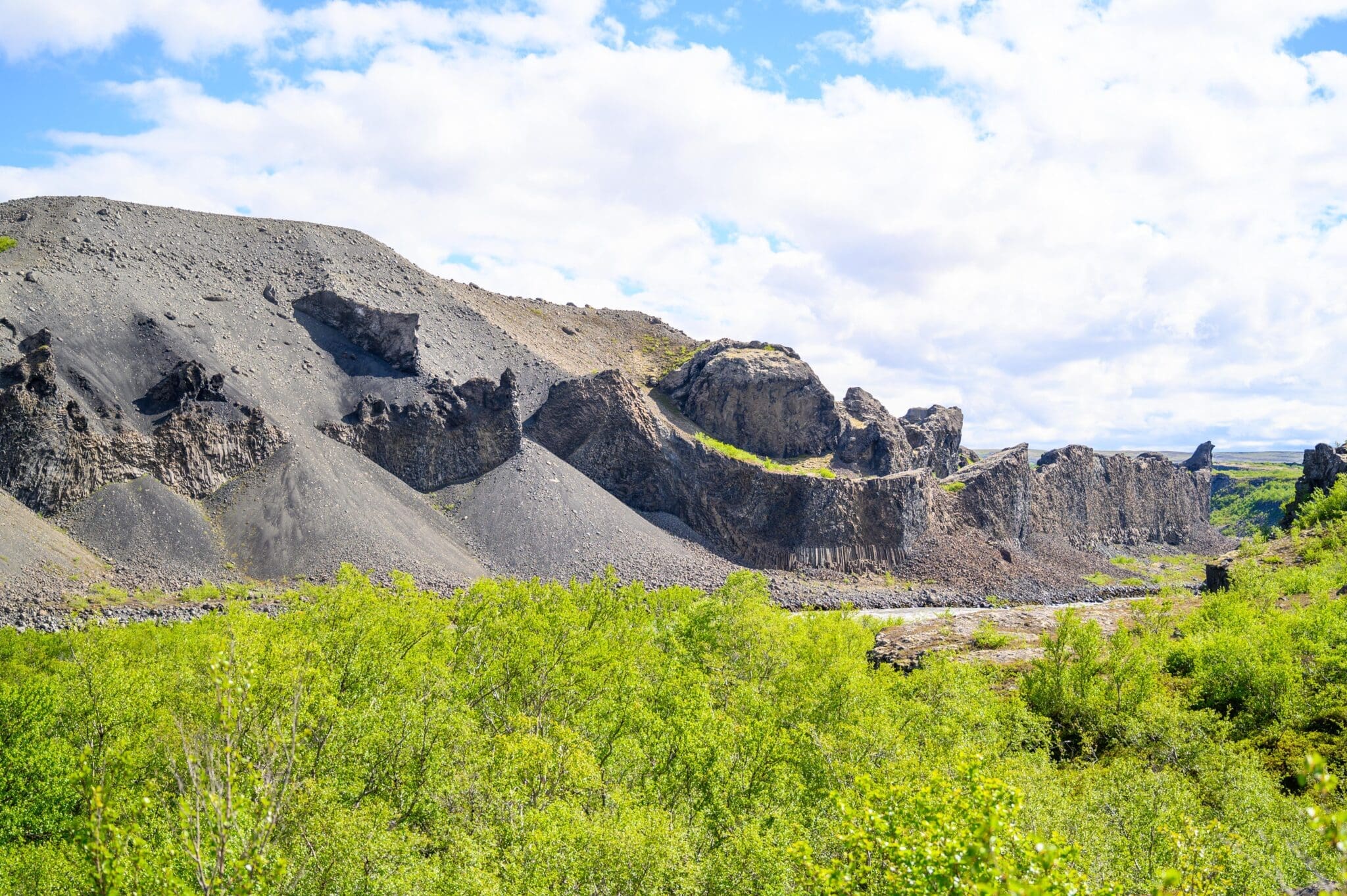 Rauðhólar scoria cone and Hljóðaklettar are a part of a long row of craters, which erupted approximately 9,000 years ago.