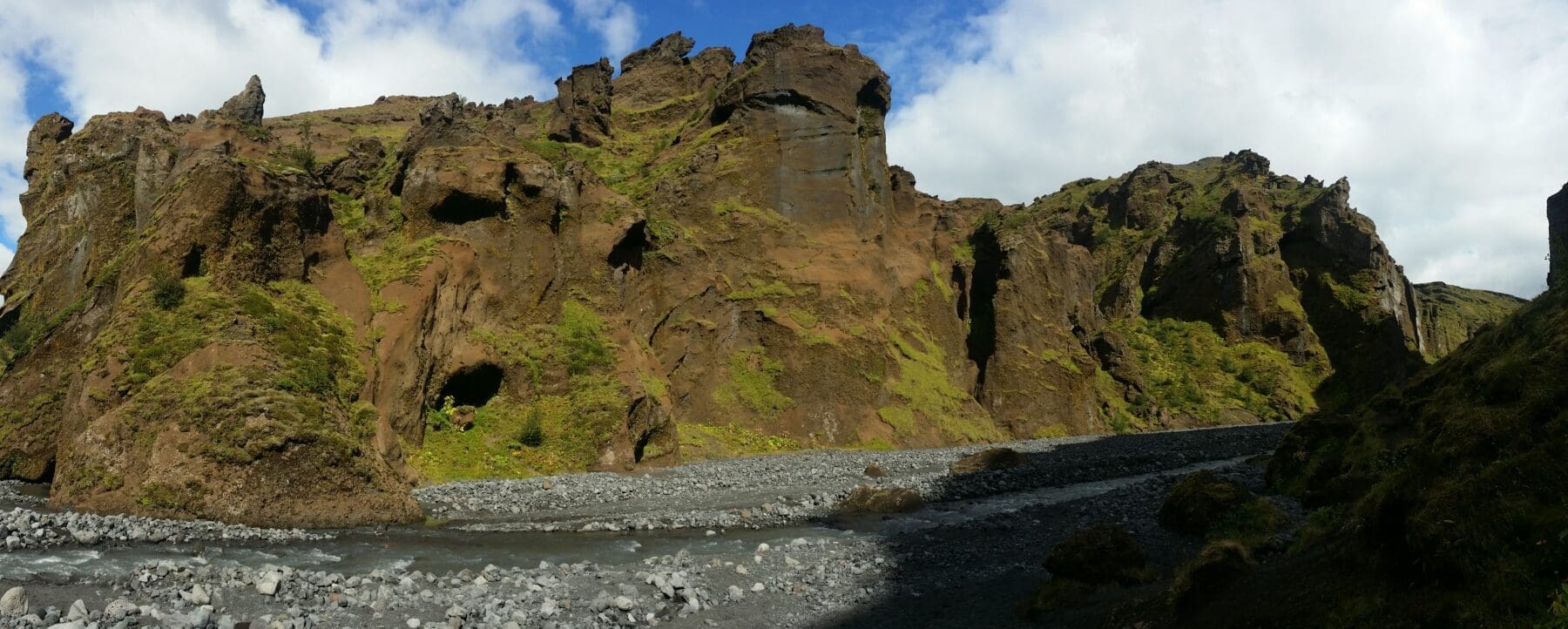 The elegant Seljalandsfoss waterfall is unique in its kind, in that you can actually walk behind the plummeting falling stream without getting (too) wet, for a unique viewing angle. After a stop there we head on to the legendary Thórsmörk valley, nestled in between three glaciers, with a stop at the Gígjökull glacier further up in the valley. From there you can hike up to the edge of the magnificent glacier Eyjafjallajökull that descends from the summit of a volcano in a jumble of crevasses.
