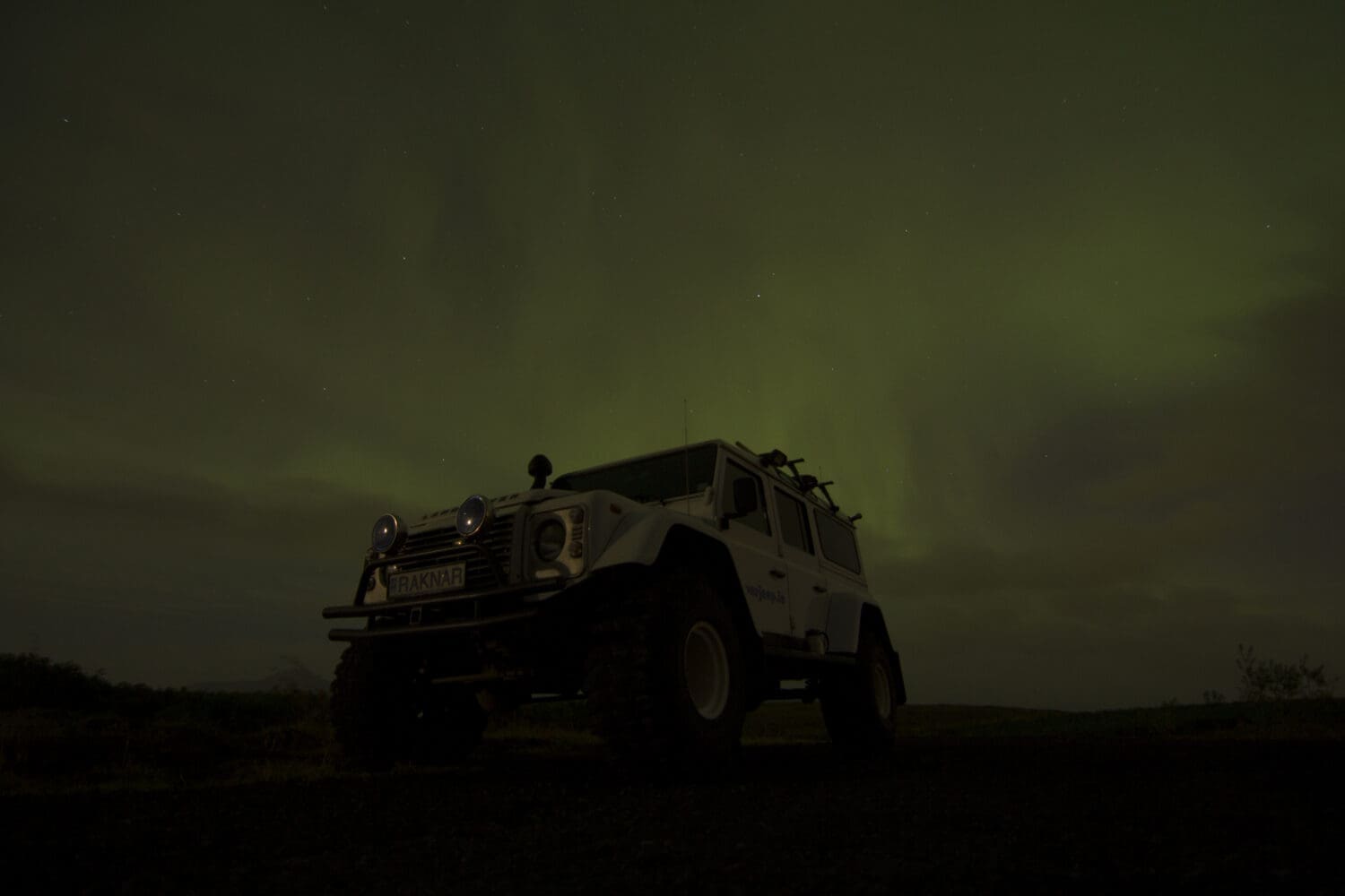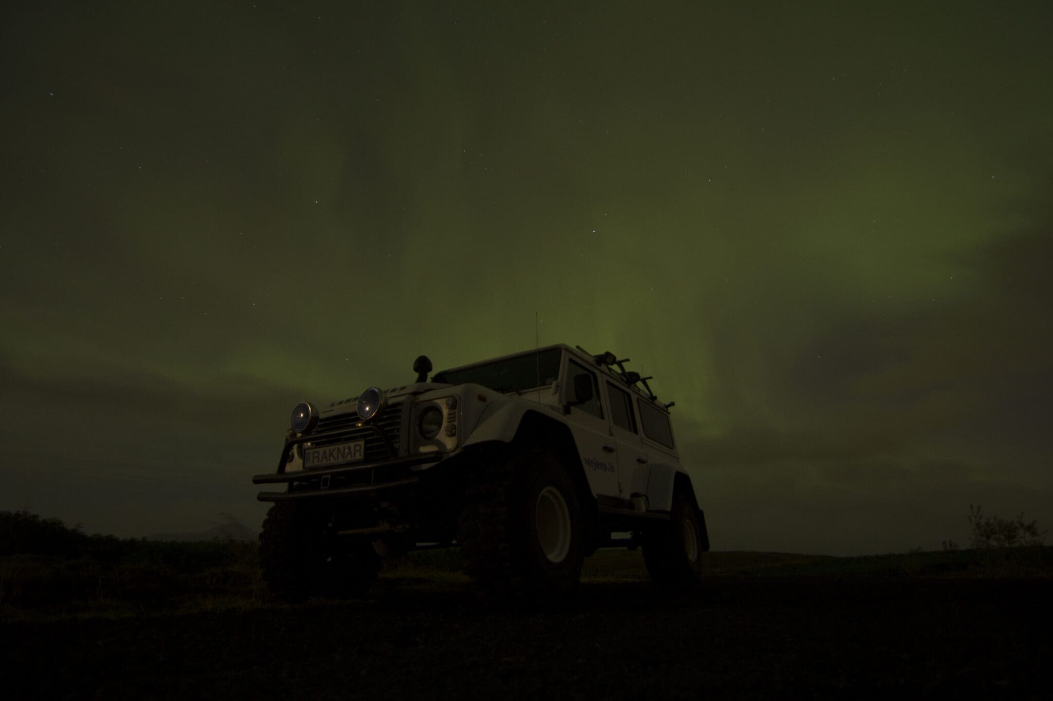 This Northern Lights tour in Iceland takes you in a super Jeep out of town, far from the city lights to observe this fascinating natural phenomenon also known as Aurora Borealis. Given clear skies and a little bit of luck, sightings can occur from autumn through to spring. The elders say that the harsher the night‘s frost, the more intense the colours will be. Swirling and swaying overhead, displays are usually greenish-yellow but white, red and pink lights can also appear. The Northern Lights Jeep tour is dependent on the weather and sky conditions and we reserve the right to cancel at any time. If the evening tour goes ahead and the Northern Lights are not seen, we will offer the trip again for free! Make sure you book your Northern Lights in Iceland tour for your first night in town in order to maximise your chances of sightings.