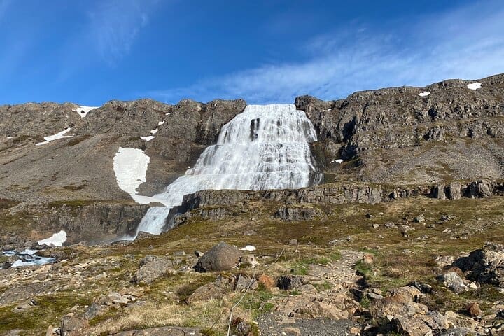 • Often called the most beautiful waterfall in the region, Dynjandi is a powerful cascade that fans out like a bridal veil down a cliff face. The main waterfall drops 100 meters, with several smaller falls below it that you’ll pass on a short but rewarding hike. Surrounded by raw, untouched nature, Dynjandi is a highlight for photographers and nature lovers alike—majestic, remote, and unforgettable.