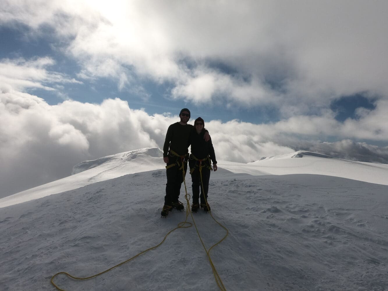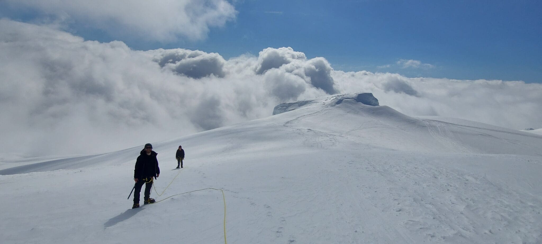 When we are at the base of the glacier, we eat some lunch and gear up for the ice. Our guides are going to teach you how to put-on harnesses, crampons and how to use them. We also need to rope up, we do this to be safe on the glacier. From the edge of the glacier, we hike a good ice slope to the summit.