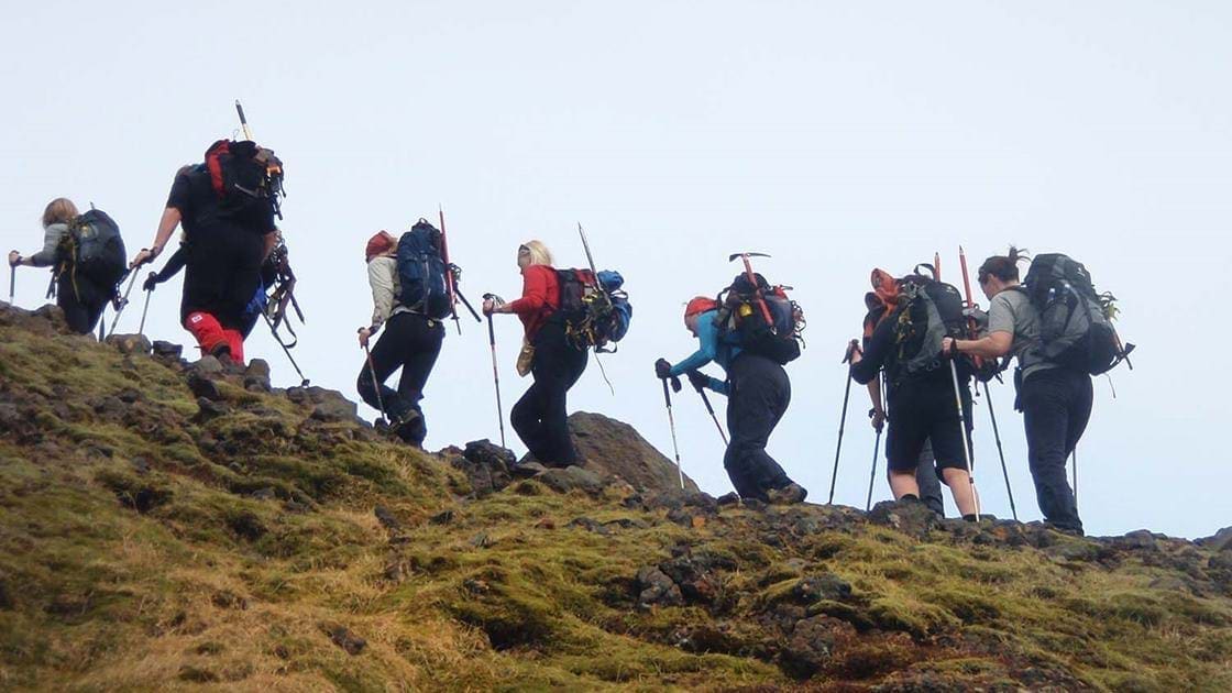 At the farm Seljavellir, by Seljavallalaug, we start the hike up to the snowline/glacier part. Your guide will brief you thoroughly and hands out the gear for the glacier part. The foothills are steep, and your guide will make sure that you go at a slow and even pace. Upon reaching the glacier at around 950m (about 3116 ft) we rope up. The vertical ascent is around 1.600 meters, and the climbing can take from 9 – 12 hours. You will need to be both physically and psychologically prepared for such a long day and make sure you have the right clothing and good boots. Please read the suggested equipment list carefully.