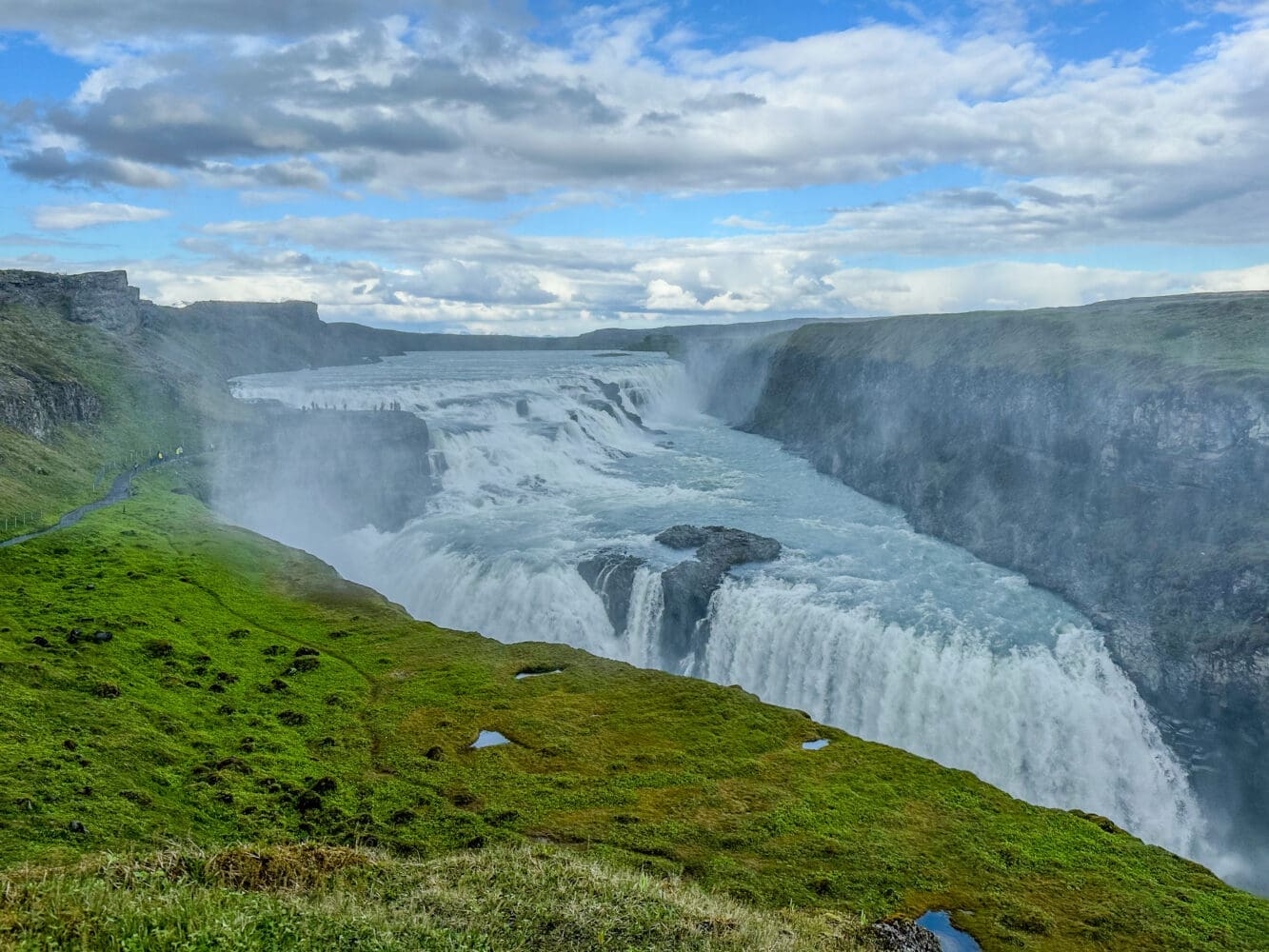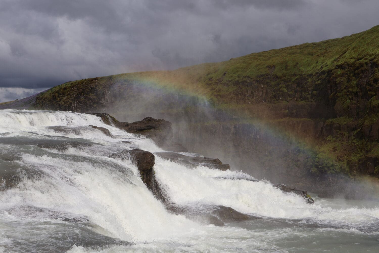 One of Iceland’s most famous sights, Gullfoss, or “Golden Falls,” is a dramatic two-tiered waterfall that crashes into a deep canyon. Walk along the well-maintained paths to admire the raw power of nature. On sunny days, rainbows often appear in the mist.