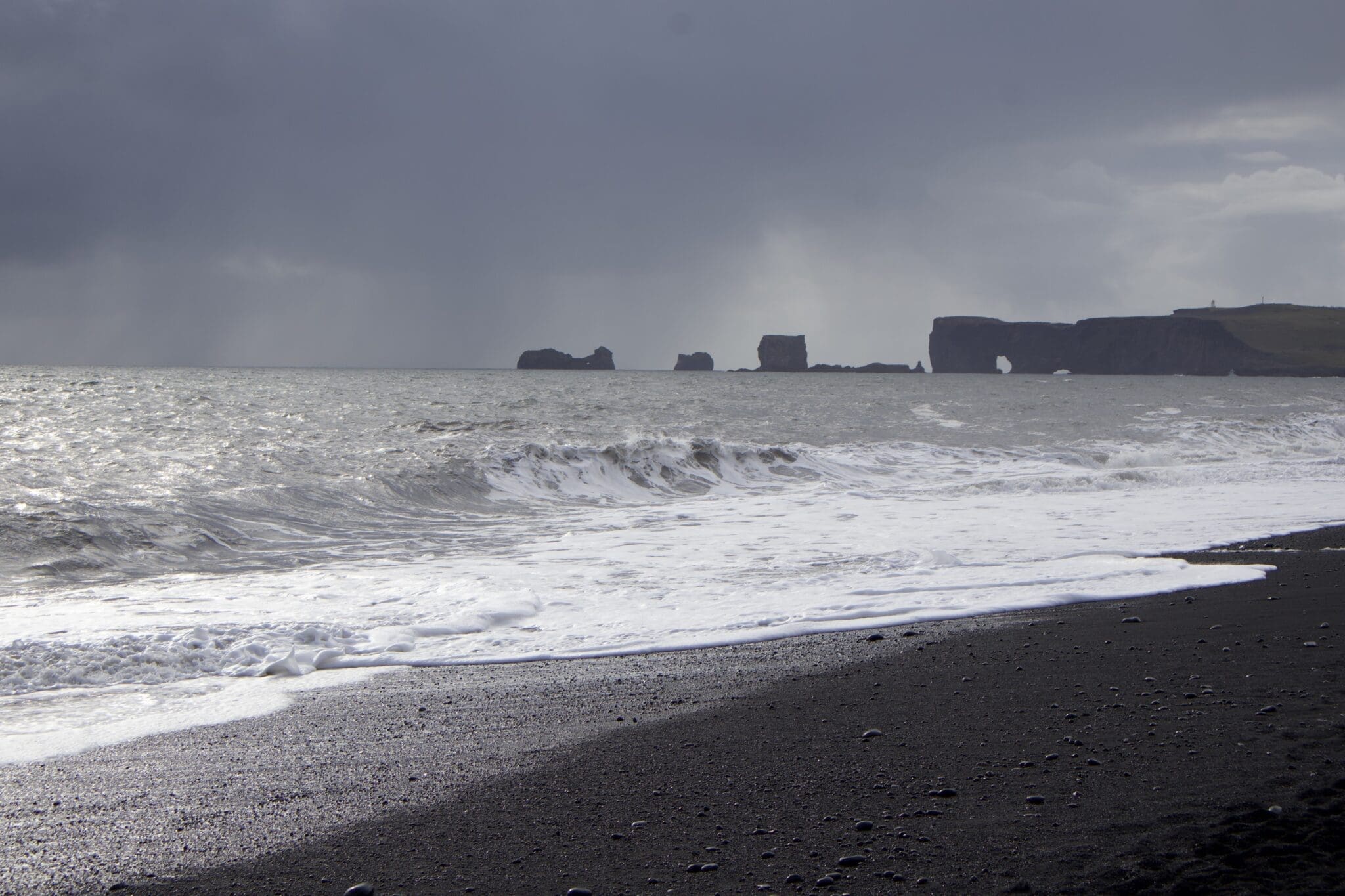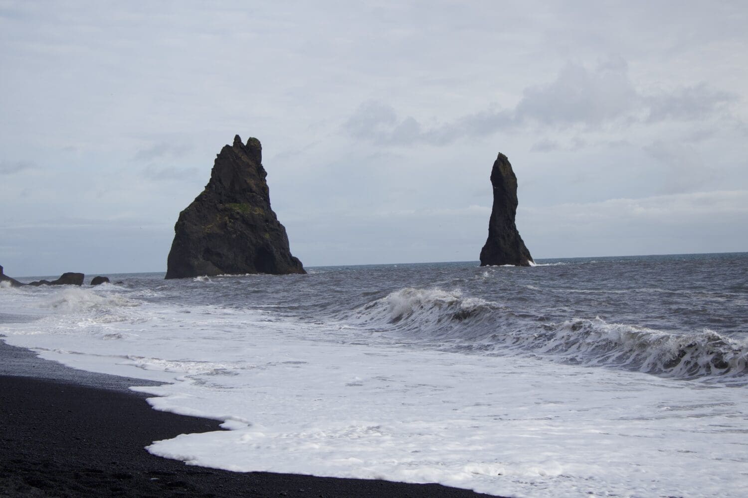Reynisfjara Black Sand Beach: Walk Iceland’s most famous black sand beach, where powerful Atlantic waves crash against basalt columns and the dramatic Reynisdrangar sea stacks.