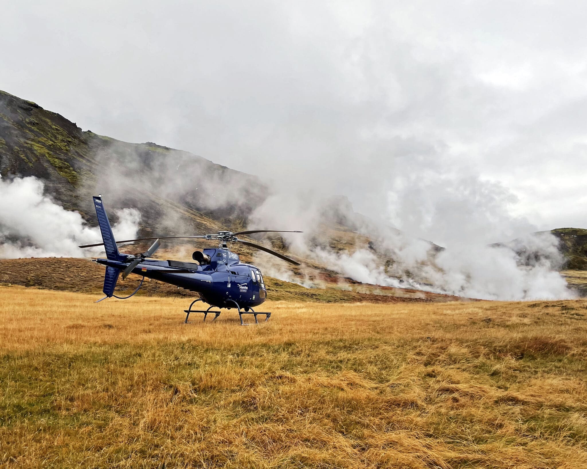 Lift off from Reykjavík on a scenic helicopter flight to the Hengill geothermal area – a colorful landscape of steaming vents and rugged volcanic valleys during this 45–60-minute flight. Land in a remote geothermal valley surrounded by nature’s raw energy before flying back over the mountains toward the city.