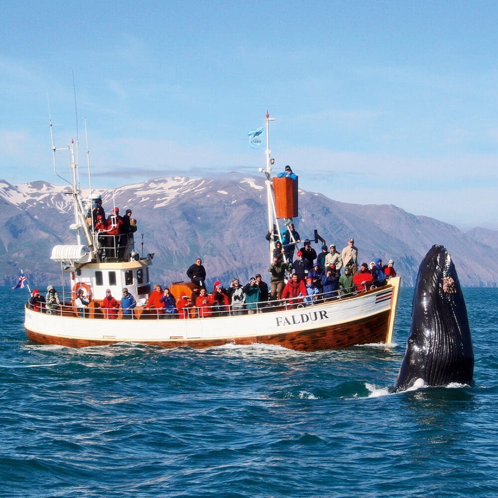 The traditional whale watching tour from Húsavík is a unique adventure at sea which has given our hometown the reputation as the Whale Capital of Iceland. After you have been equipped with a warm safety overall, sail out into the bay on a comfortable oak boat and prepare to be captivated by nature. Your specialized wildlife guide will demonstrate the safety on board and give you live commentary on the sights encountered throughout the tour. Your oak boat has been thoroughly renovated as a safe passenger vessel and plays an important role in Iceland’s maritime history and culture.