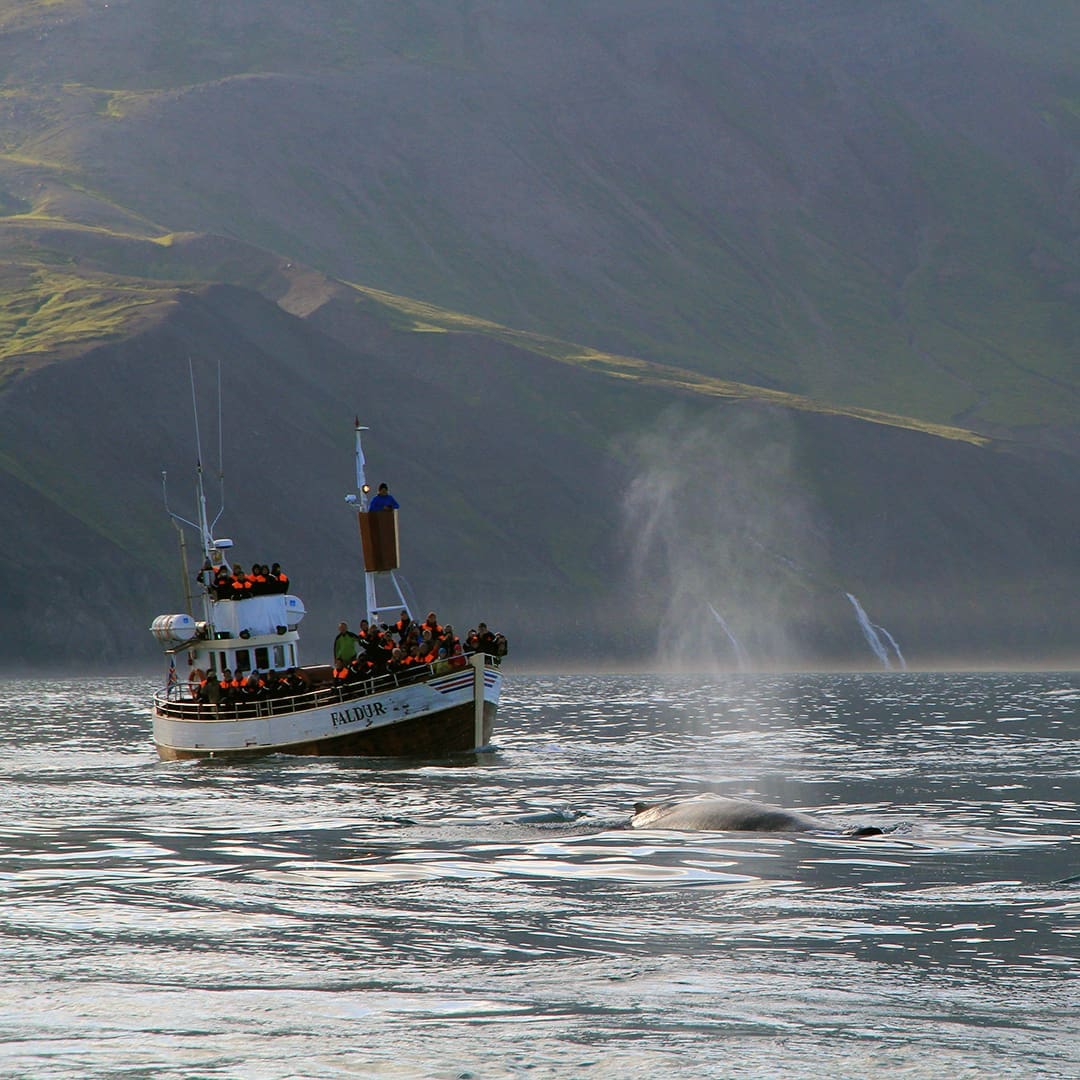 Skjálfandi Bay is well known for its rich wildlife. Numerous types, shapes and sizes of whales visit the bay, including the acrobatic humpback whales and playful white-beaked dolphins. This is wild nature and unpredictable, but your chances of seeing whales in their natural environment are high.