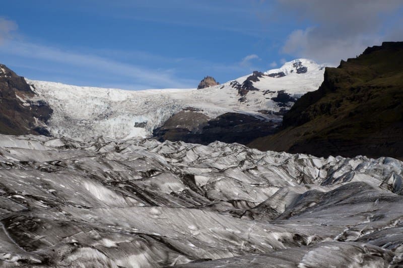 4 hour Glacier Hike on Crampons on Falljökull, part of the great Vatnajökull Glacier in Skaftafell National Park. This is a moderate glacier tour in the majestic surroundings of Falljökull. The glacier is hemmed in by some of Iceland´s most spectacular peaks. We climb the Falljökull glacier tongue up to the deep glacier valley between the summits of Hvannadalshnúkur and Hrútsfjall. We will traverse zones of different glacial formations where huge water cauldrons, deep crevasses, and strangely shaped ridges and other ice formations await our discovery.