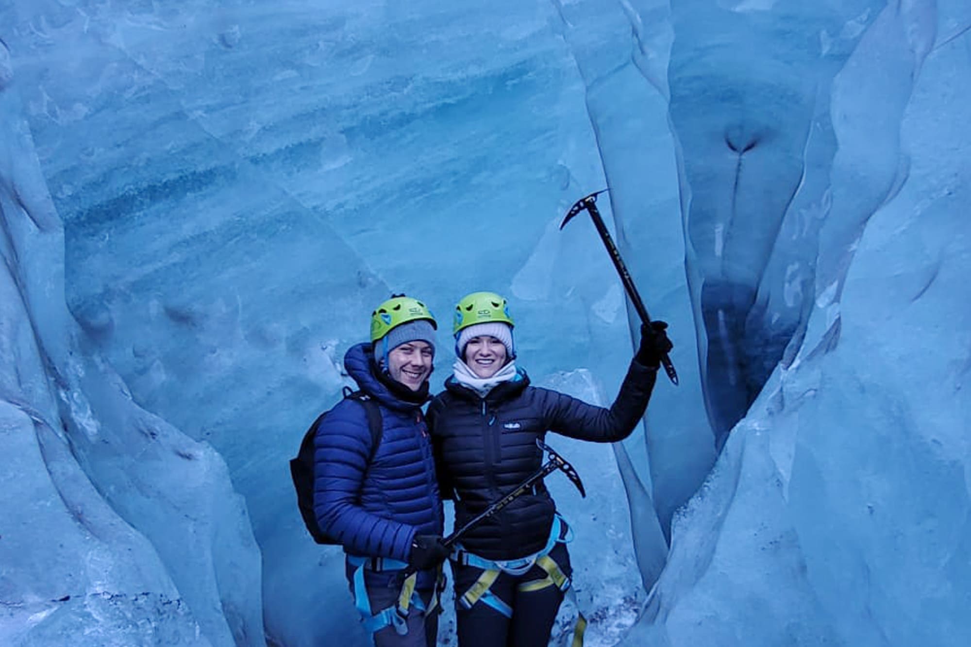 After that it’s time to strap on a pair of crampons grab your ice pick and helmet and hike on the ice, through twists and turns on the glacier of Solheimajokull.