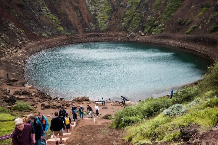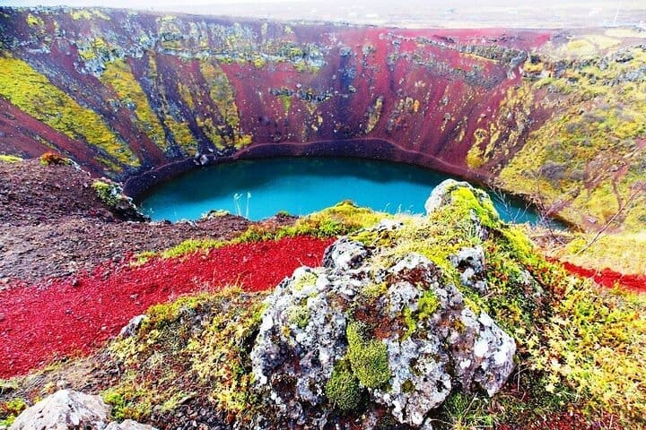 7. Kerið Crater Lake: is a breathtaking volcanic crater that boasts vibrant turquoise waters. You can enjoy a relaxing walk along the rim of the crater while admiring the striking contrast between the red volcanic rock and the beautiful azure lake below.