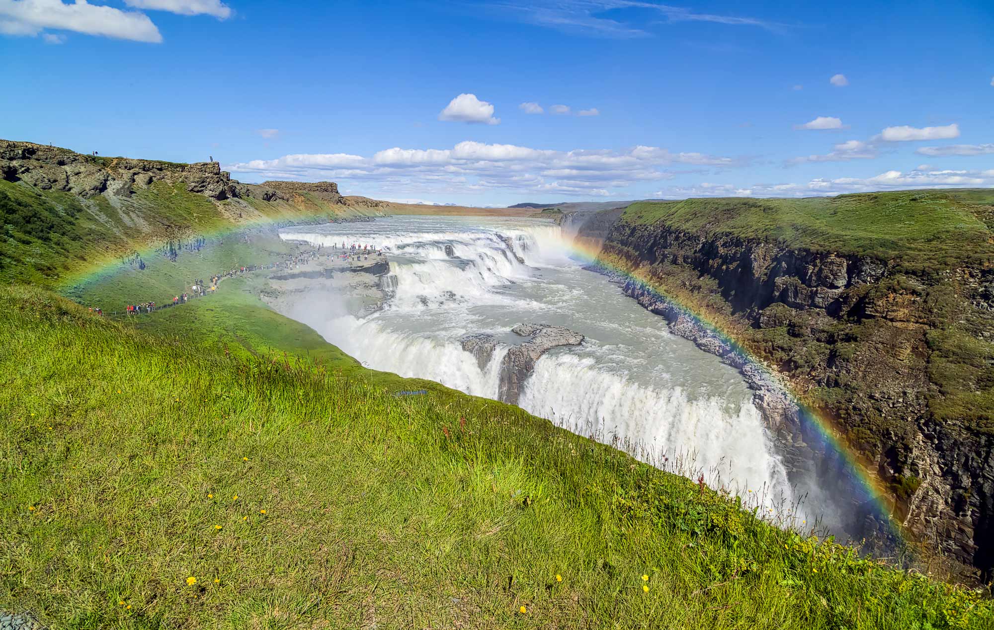 The melting water from Iceland's second biggest glacier, Langjökull, falls into a deep canyon forming the majestic “Golden Falls”. On a sunny day, you can see the glacier Langjökull in the distance and enjoy a rainbow in the mist of the waterfall, an Instagram blockbuster waiting to happen!