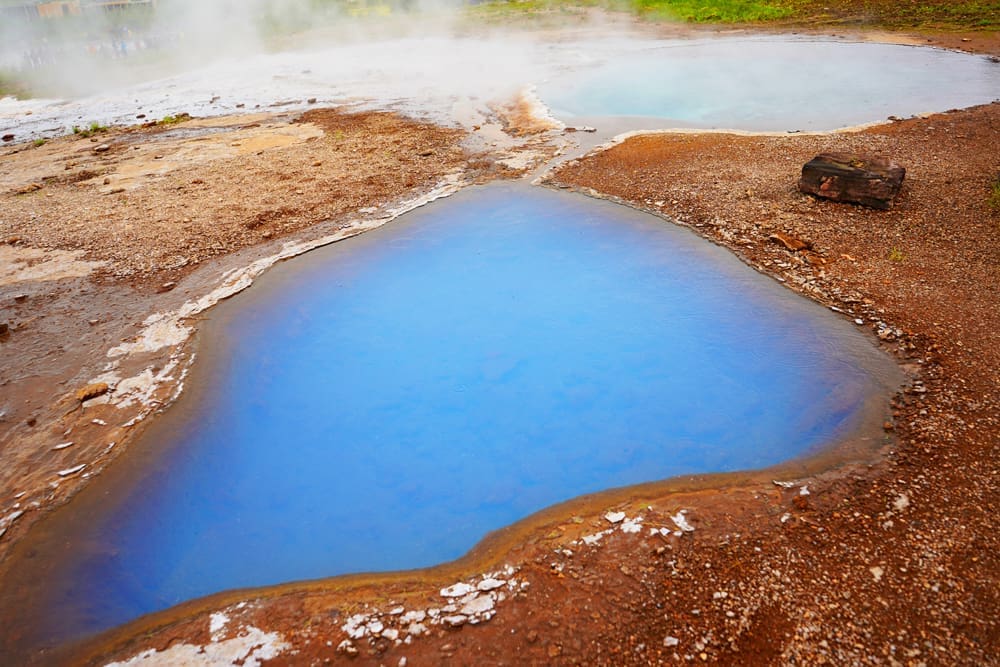 Strokkur, a fountain geyser, is famous for its frequent eruptions, every 5-7 minutes. It sometimes can erupt to 40 meters height.Blesi the google looking volcanic spring. At the geothermal area one can take a look at this very special spring. The southern pool is clear with hot water but the northern pool is cold and blue color.