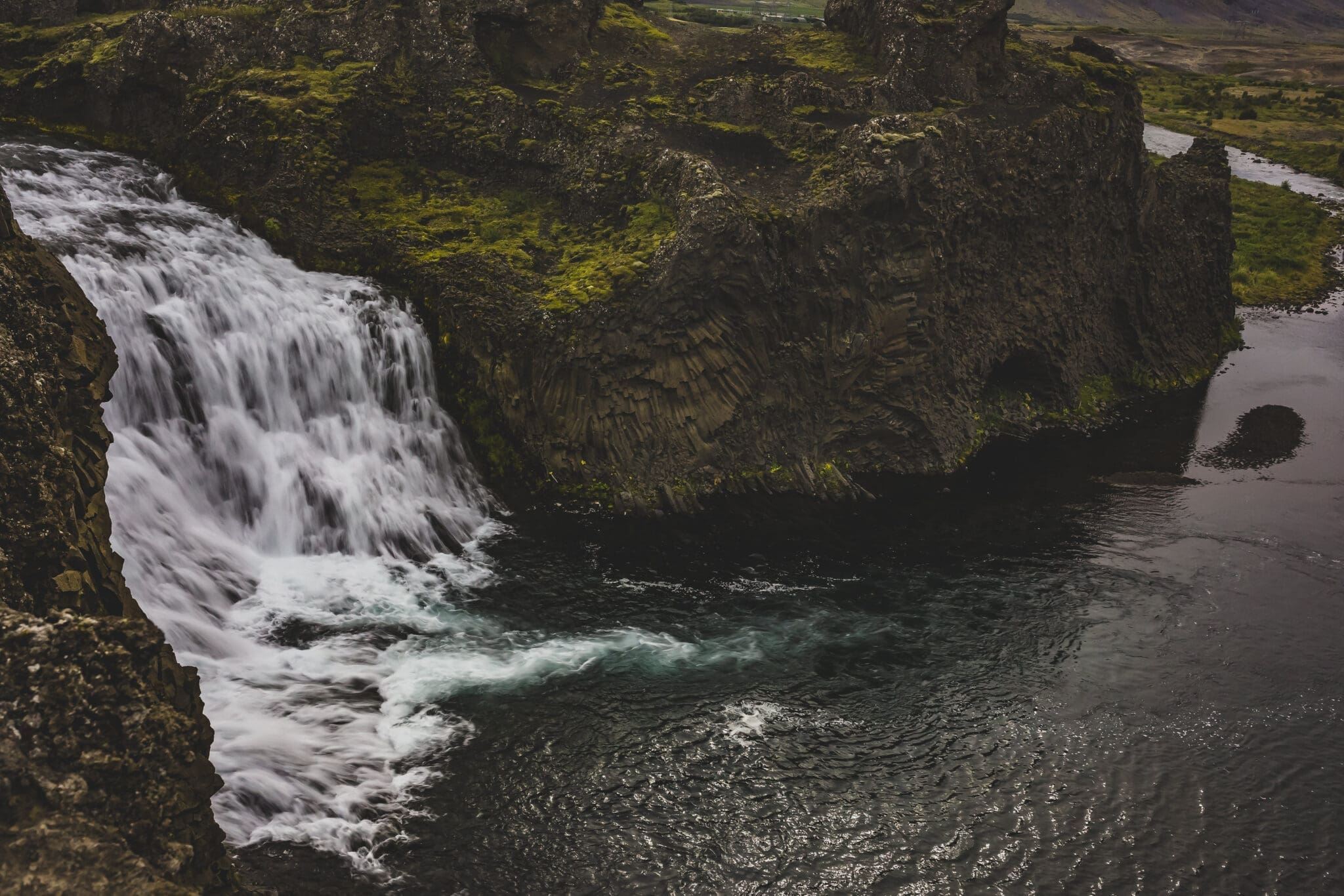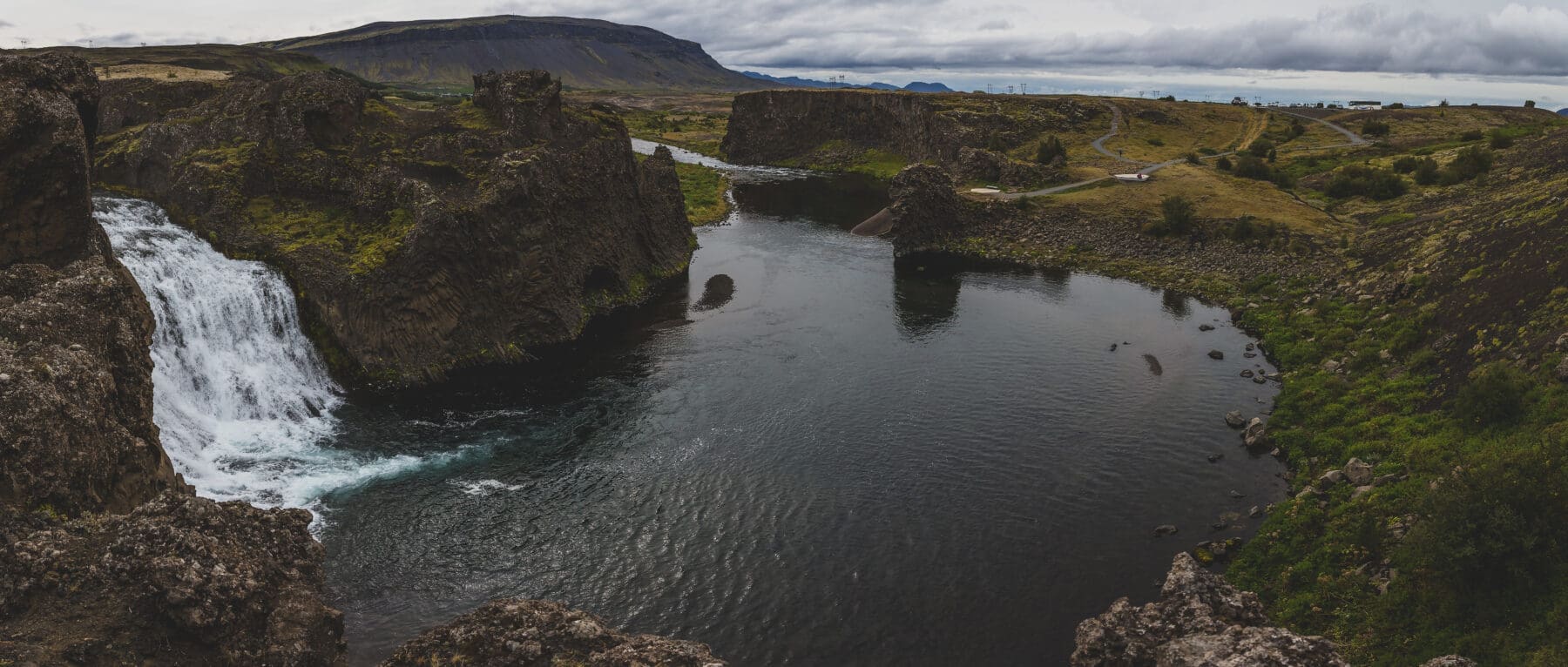 Hjálparfoss is a unique twin waterfall where two streams merge into one, framed by striking basalt columns and lava formations. The area offers an easy walk and beautiful contrasts between dark volcanic rock and flowing water, making it a perfect introduction to Iceland’s raw highland scenery.