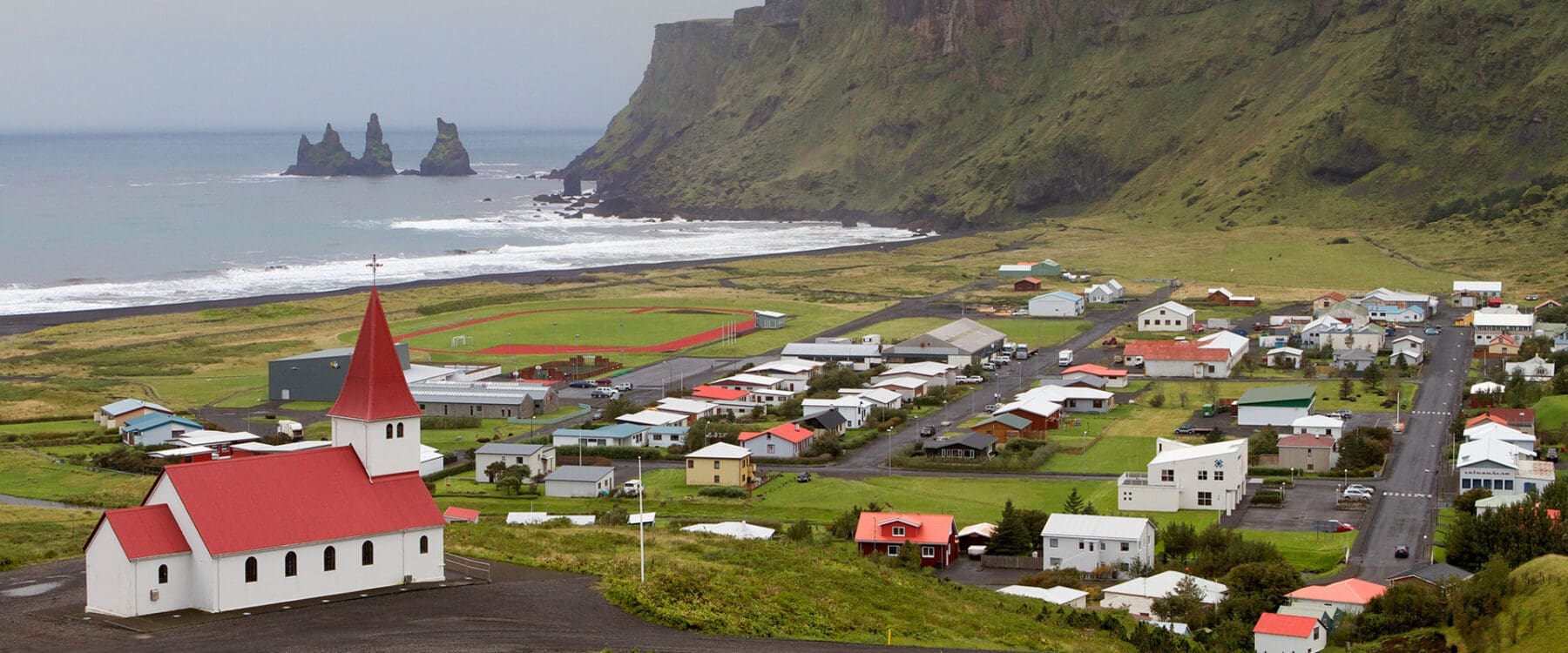 Vík is a charming village surrounded by high beautiful bird cliffs. Reynisdrangar can be seen when looking towards the shore.