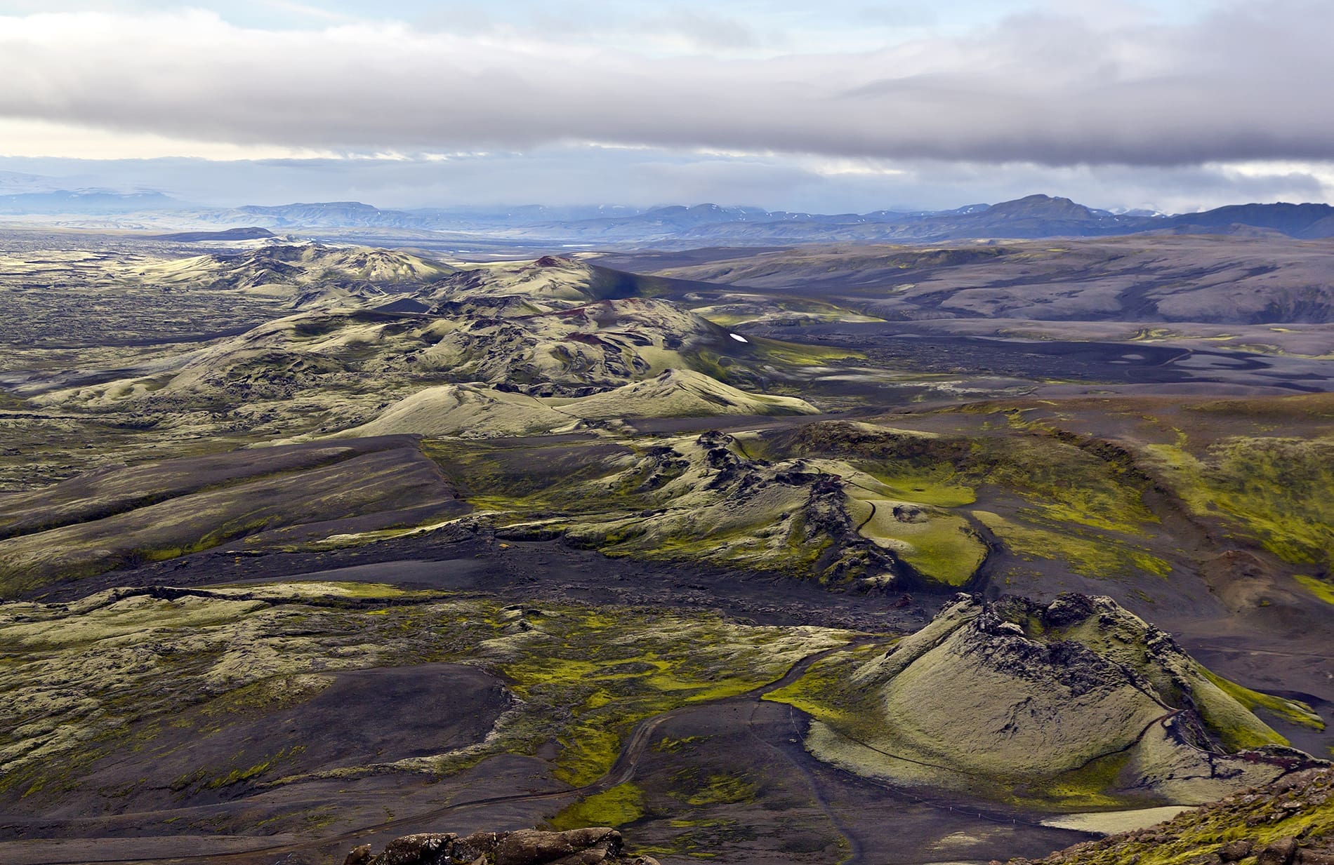 Lakagígar, the Craters of Laki is a 27 kilometres long eruptive fissure consisting of 140 craters. The mountain Laki is standing in the middle of the row and from the top of the mountain is amazing view. The craters started to erupt 1783 resulting in the largest lava flow in the recorded history.