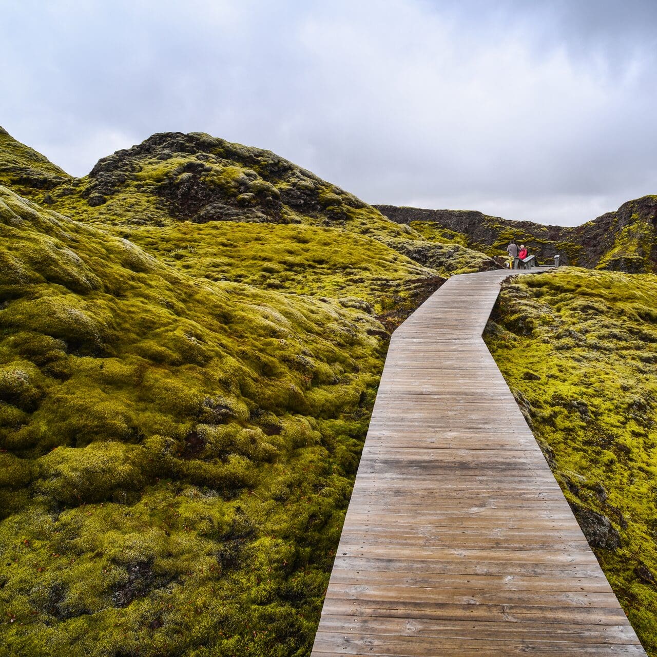 From there, you’ll continue your journey, following the row of craters through a lava field on a narrow track, eventually completing the loop around Lakagígar.