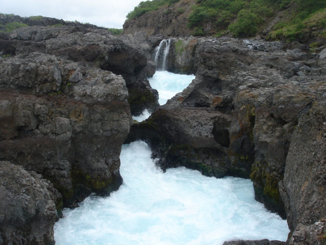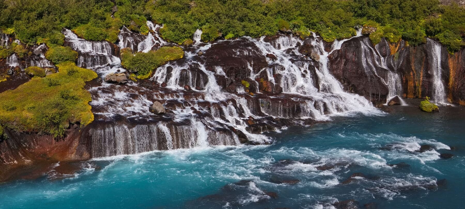 Barnafoss and Hraunfossar are stunning waterfalls in West Iceland, steeped in Viking legends and Icelandic sagas. Hraunfossar features gentle cascades streaming through lava fields, while Barnafoss flows rapidly through a narrow, rocky gorge, said to be haunted by a tragic tale of two children who fell into its waters.